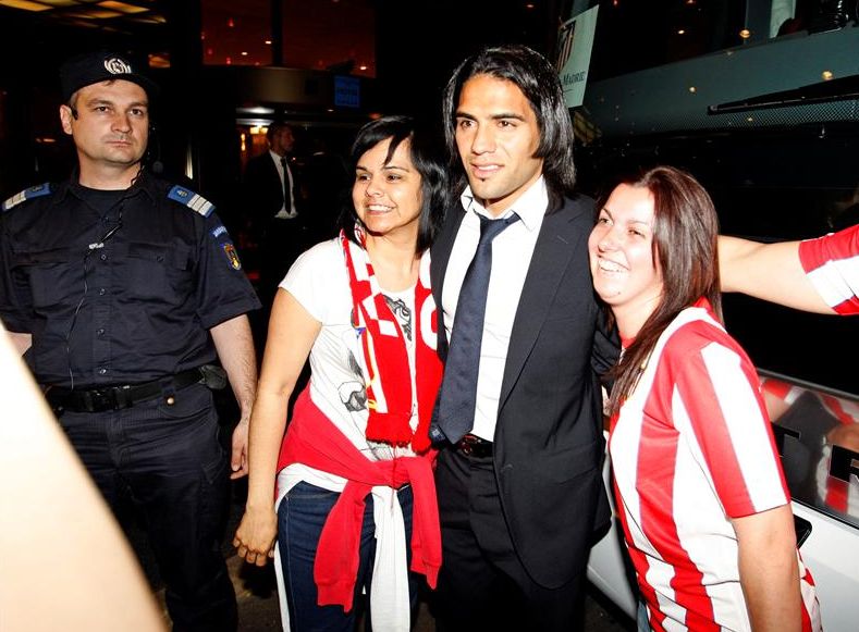 El delantero colombiano Radamel Falcao, máximo goleador de la Liga Europa, se fotografía con dos aficionadas a la llegada del Atlético de Madrid a Bucarest.