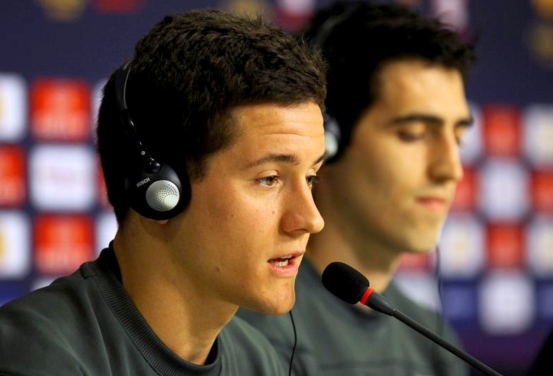 Ander Herrera (i) y Andoni Iraola fueron los jugadores del Athletic Club que comparecieron en la sala de prensa del Estadio Nacional de Bucarest.