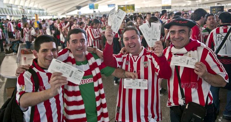 Seguidores del Athletic, con entradas para la final en la mano, son fotografiados en el aeropuerto de Sondica.