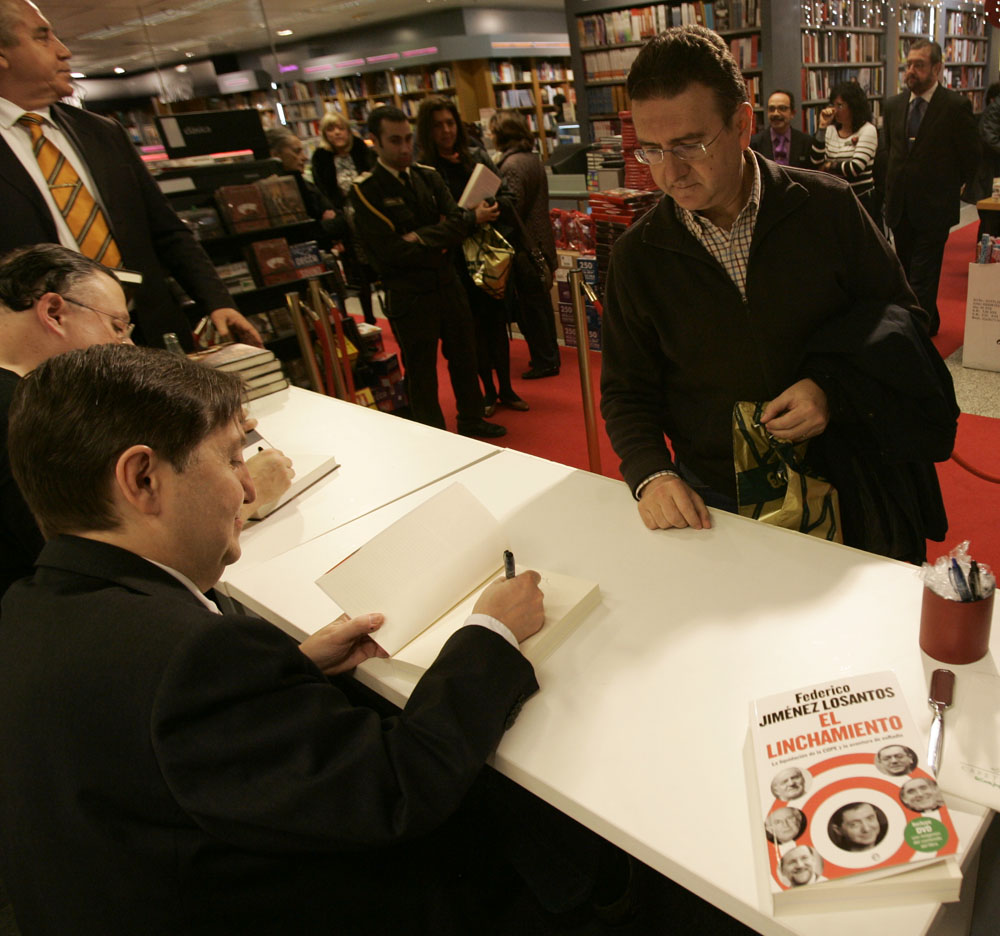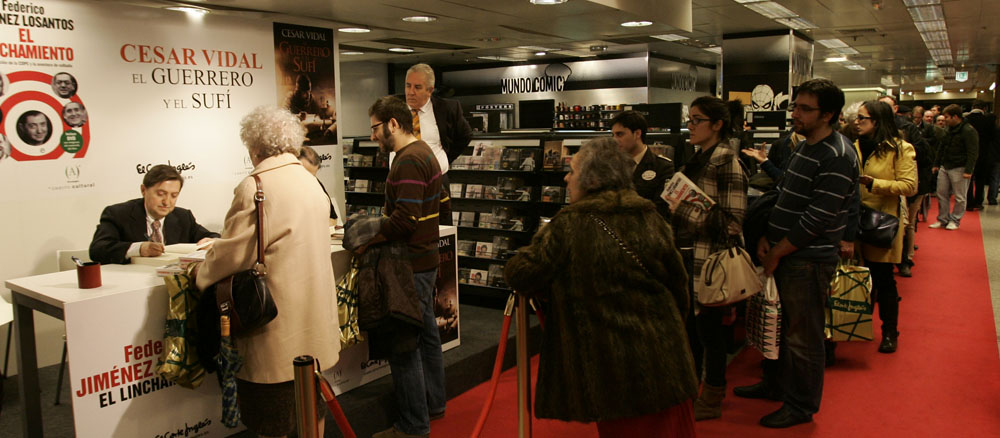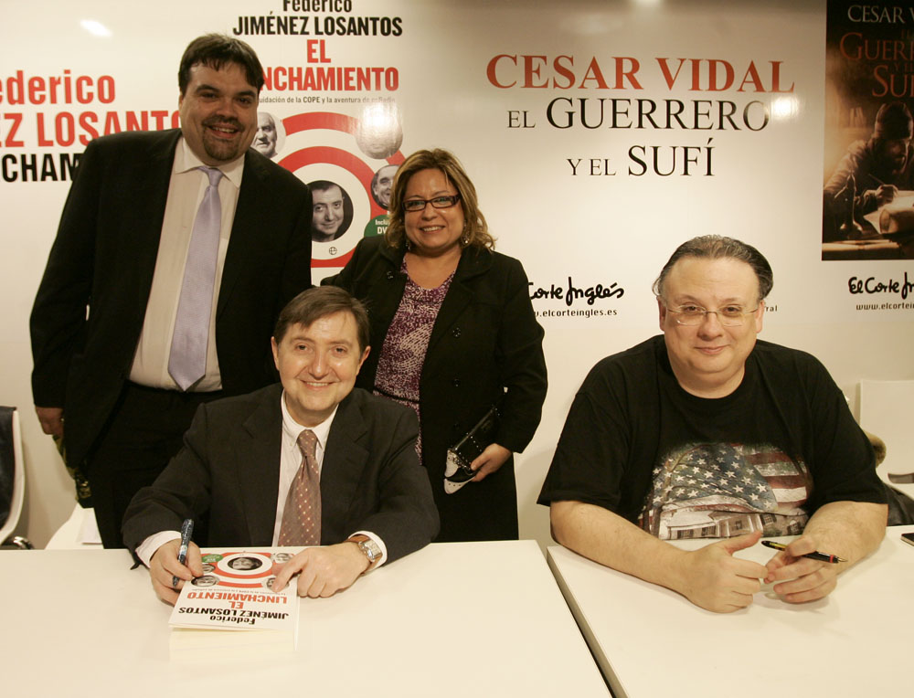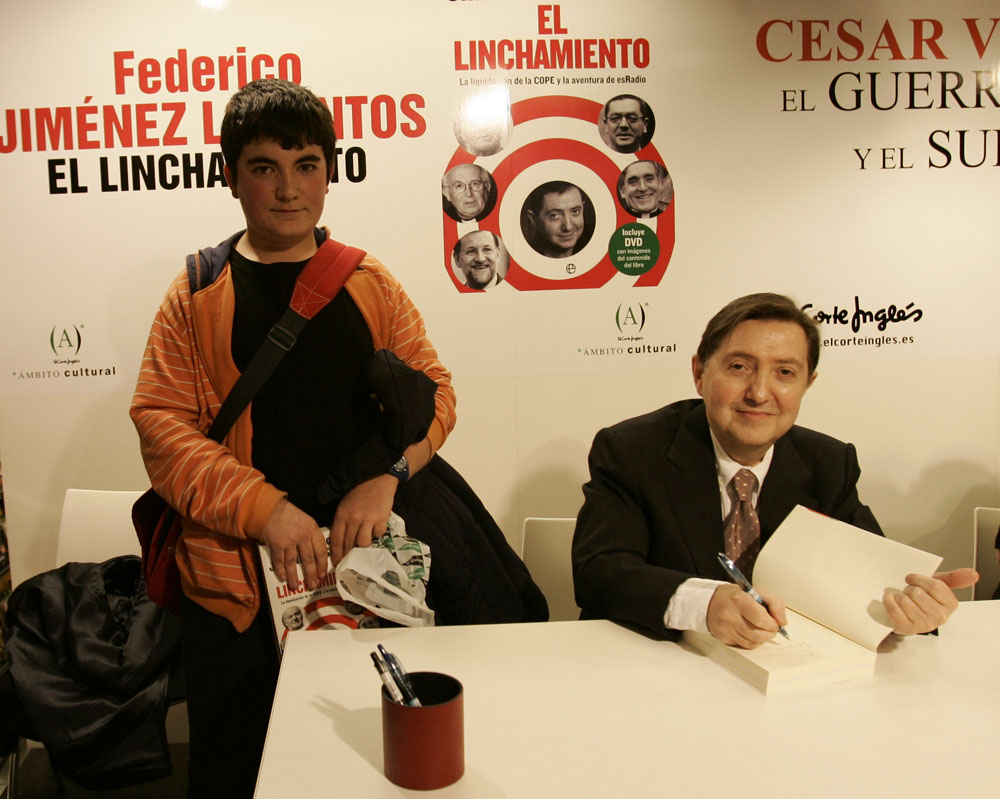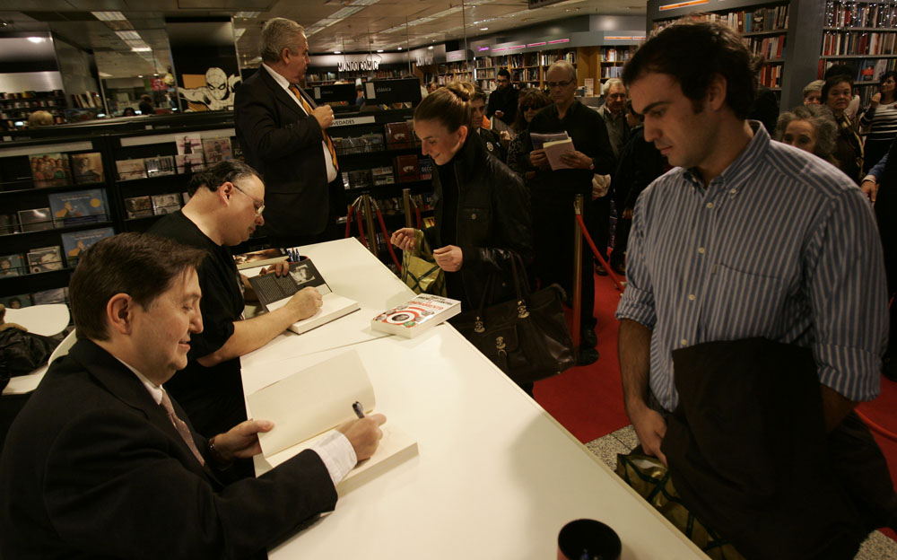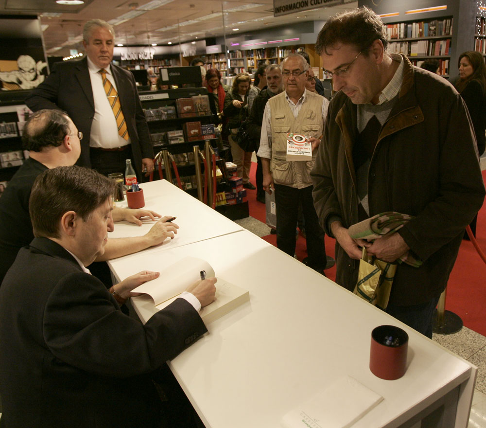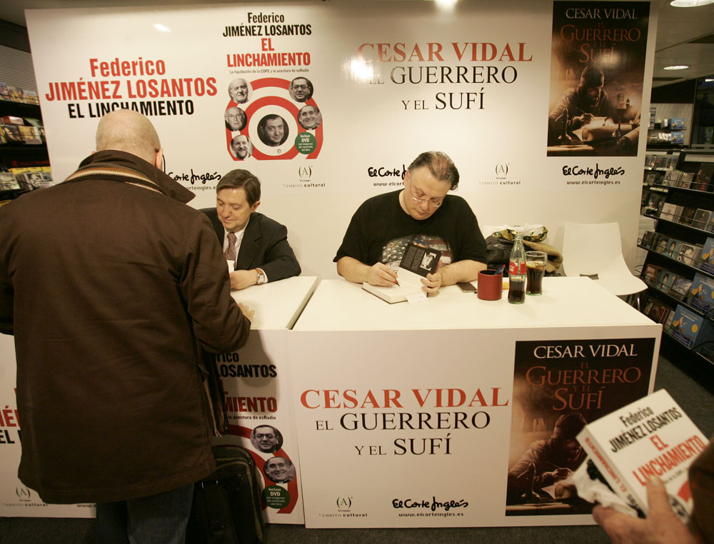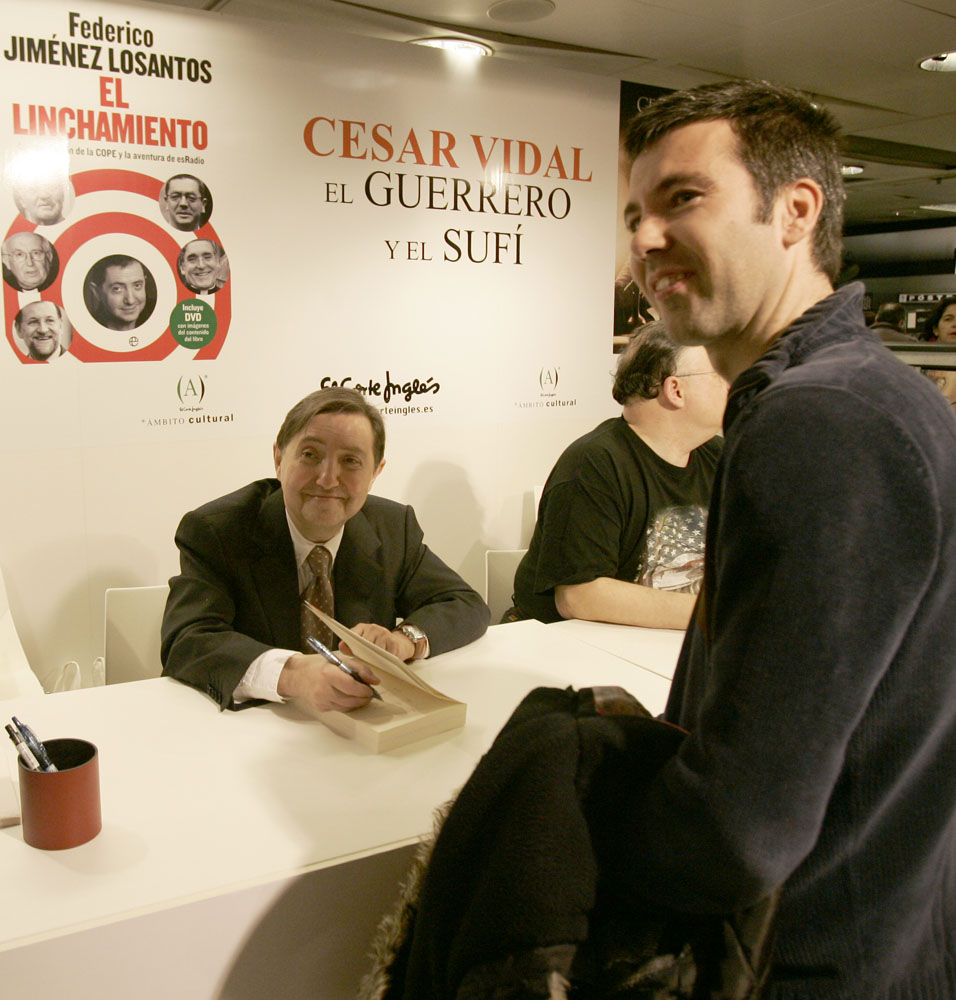 Federico Jiménez Losantos y Cesar Vidal firmaron sus libros en el Corte Inglés de Castellana. Como en sus últimas salidas, decenas de personas hicieron cola para llevarse un libro firmado. | J. Baró