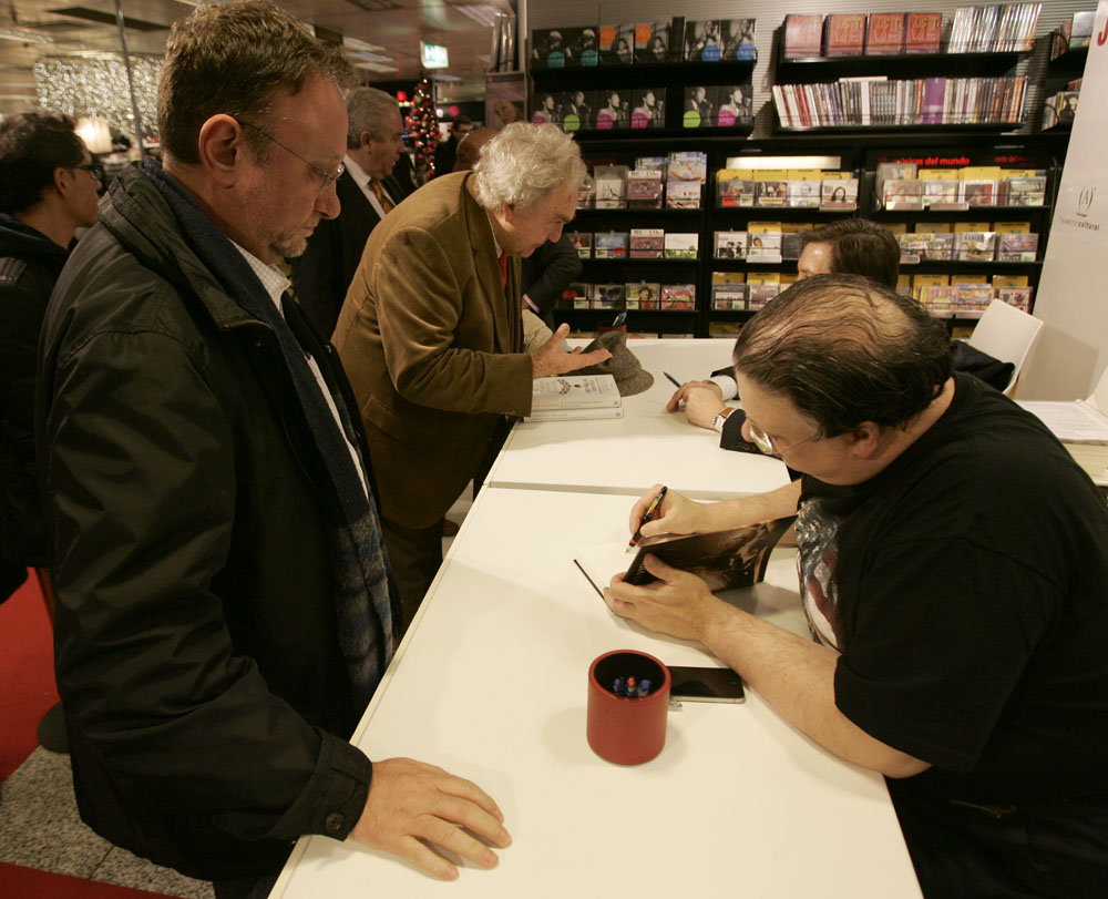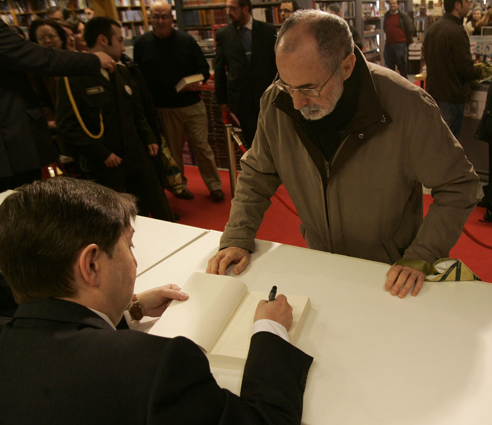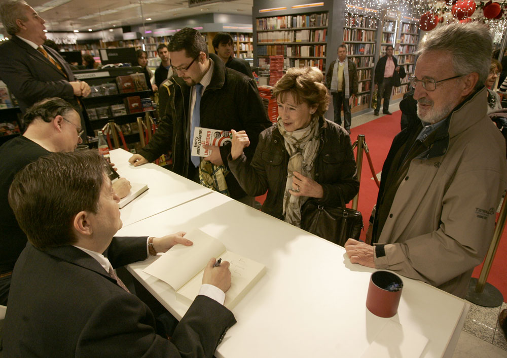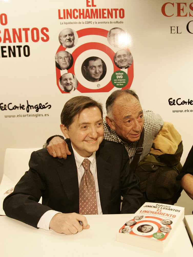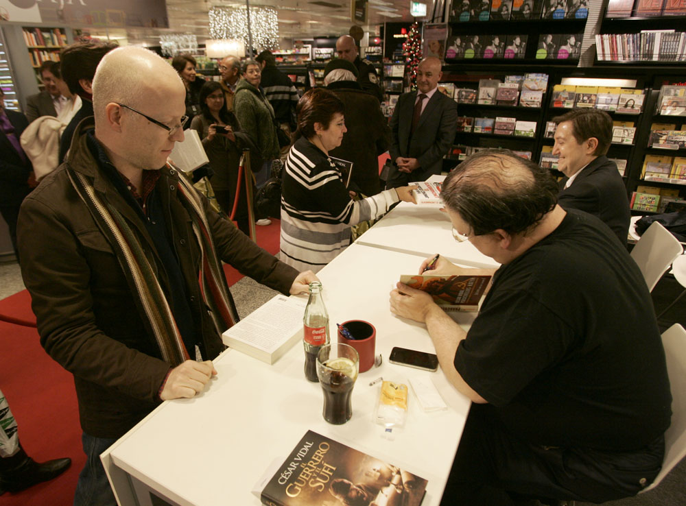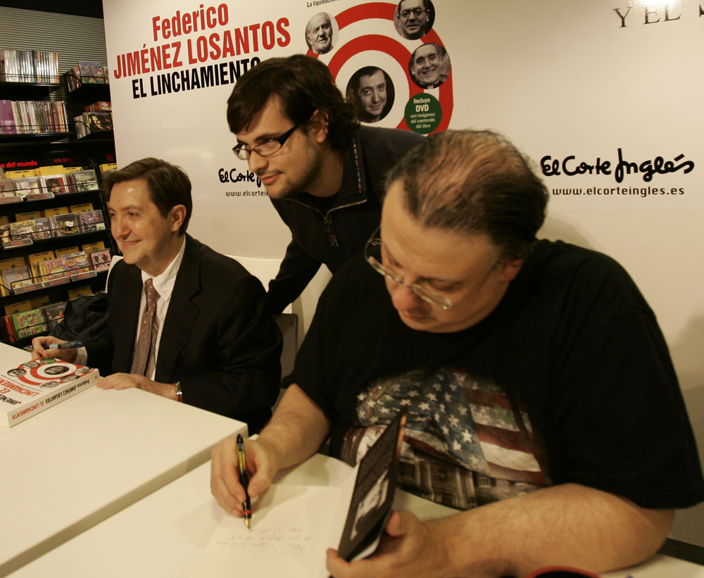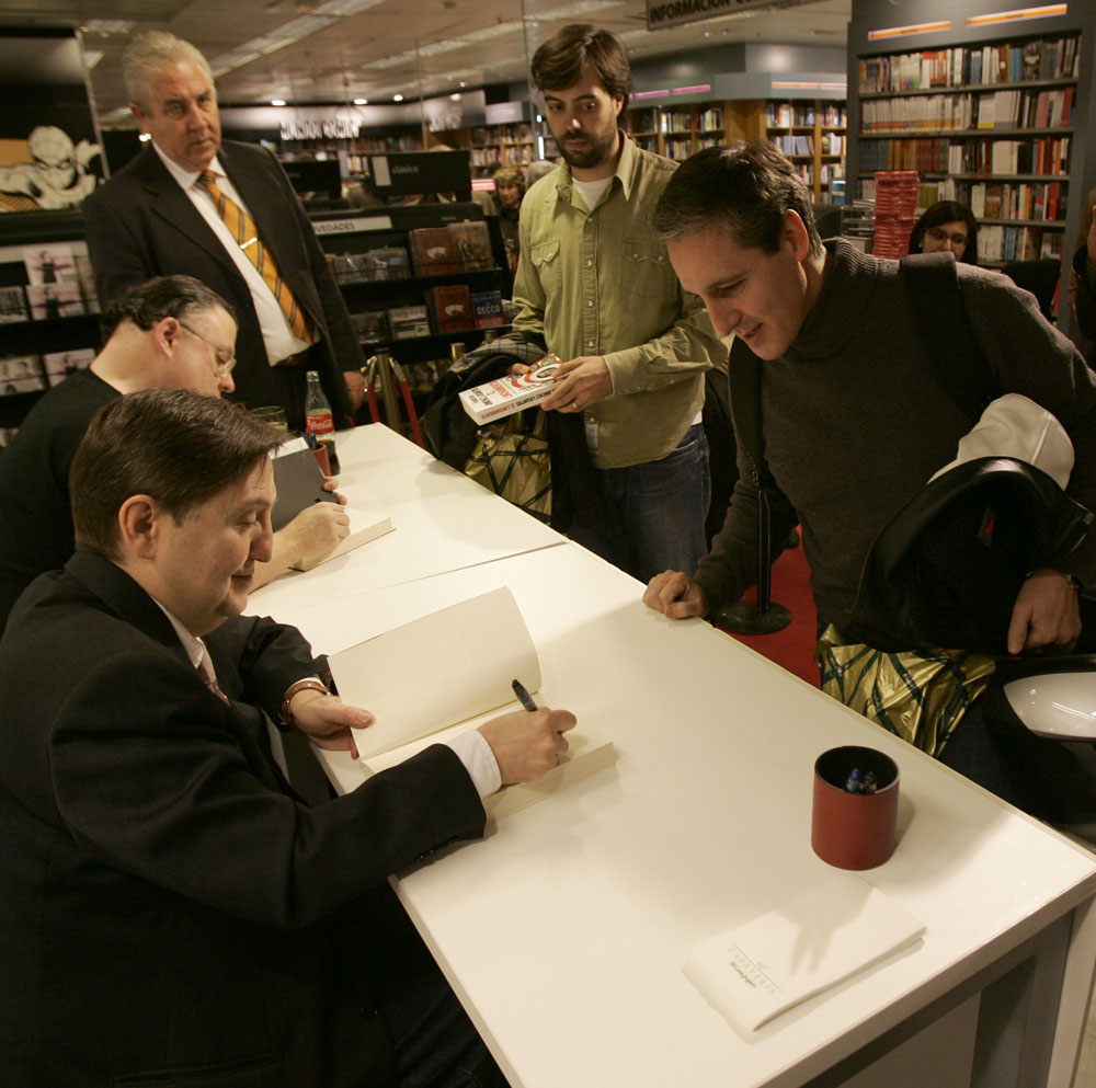 Federico Jiménez Losantos y Cesar Vidal firmaron sus libros en el Corte Inglés de Castellana. Como en sus últimas salidas, decenas de personas hicieron cola para llevarse un libro firmado. | J. Baró