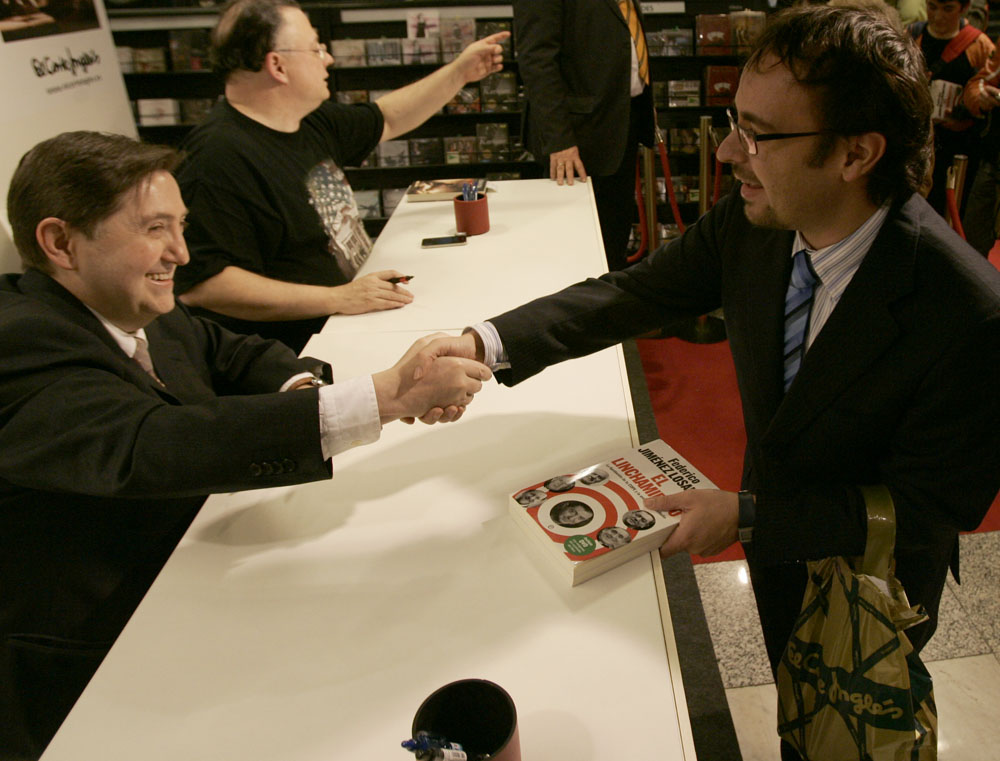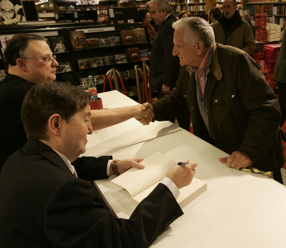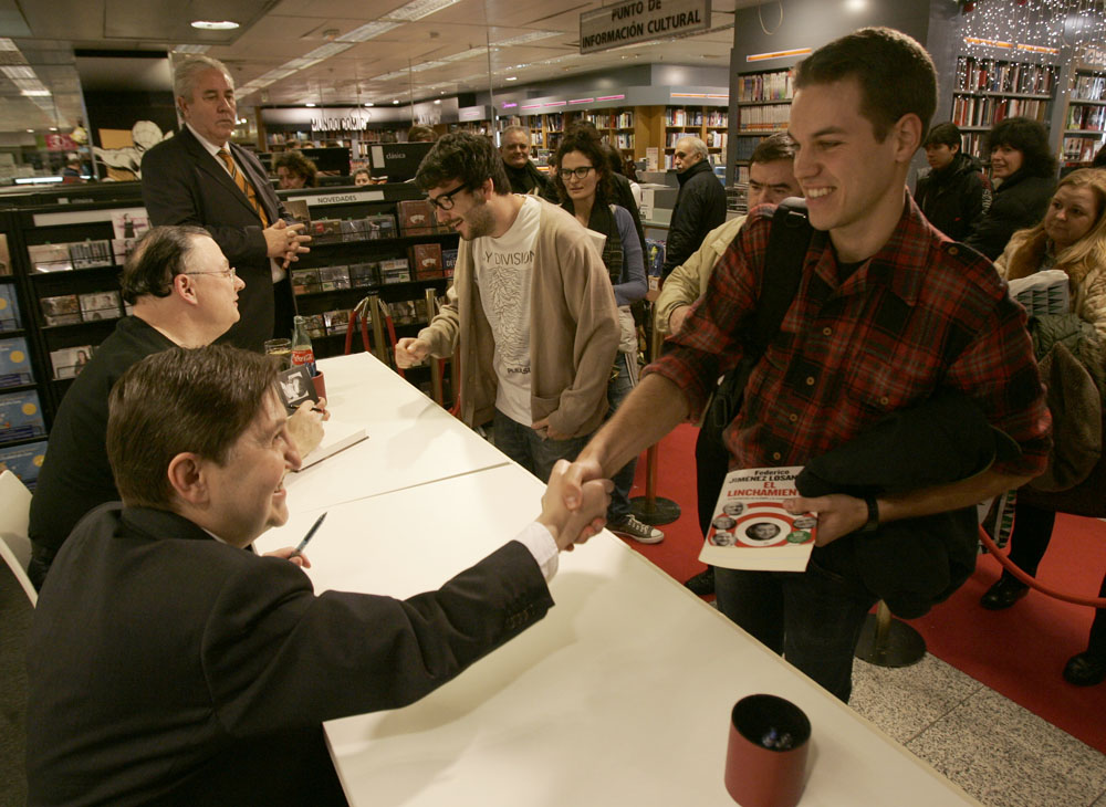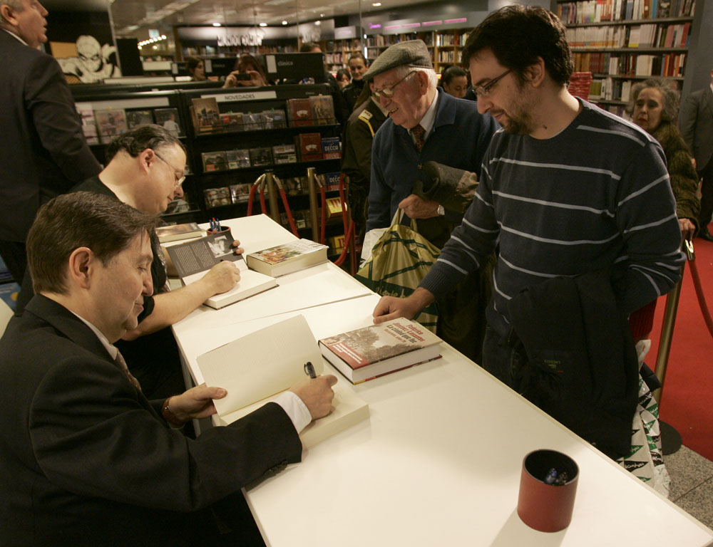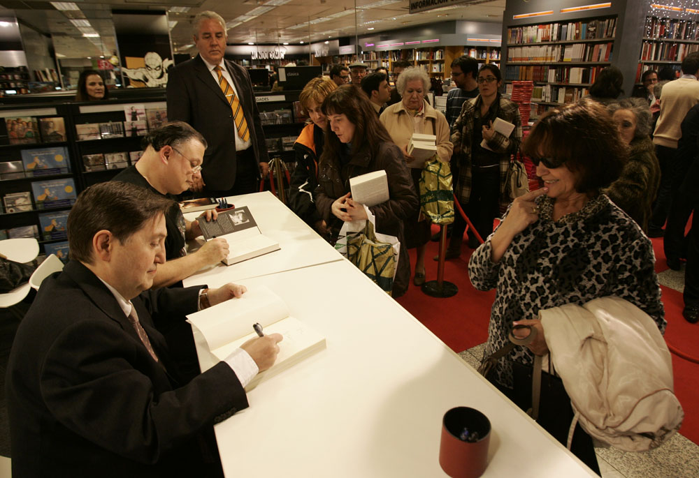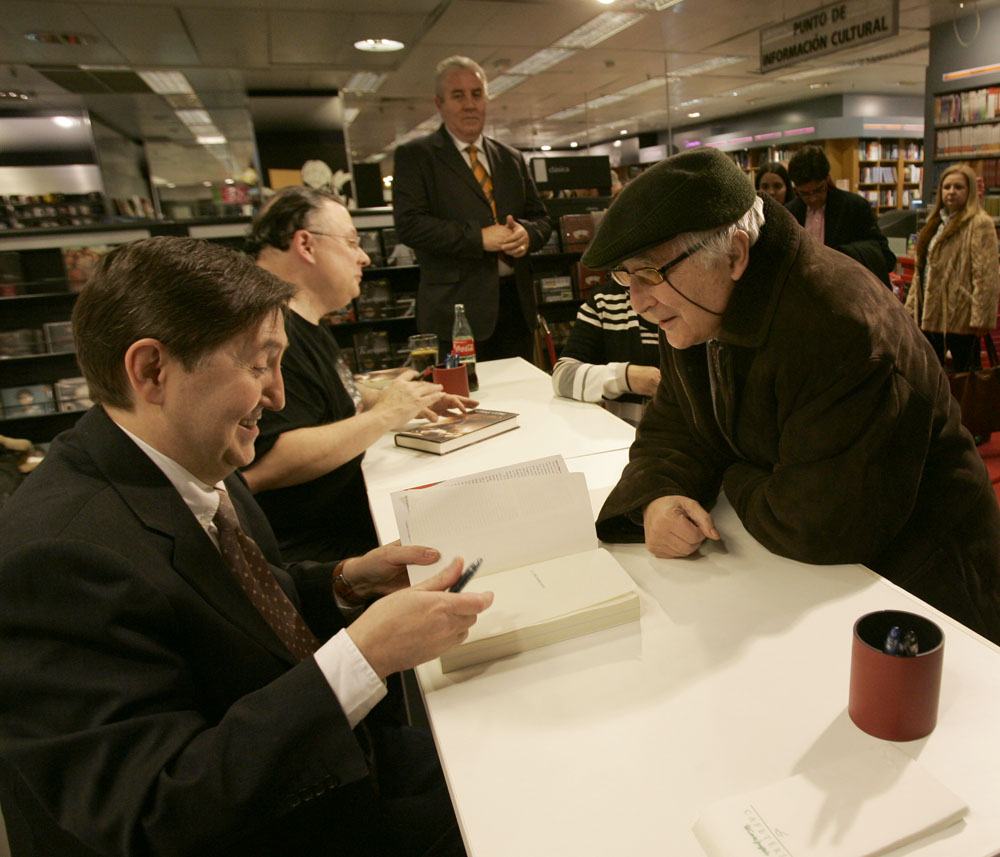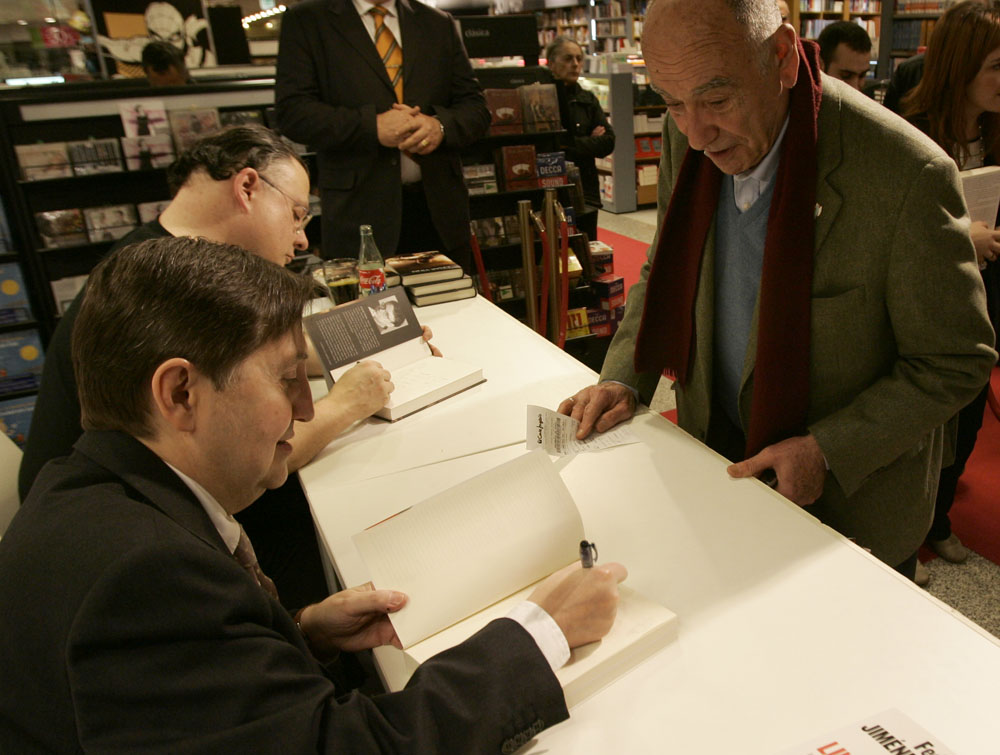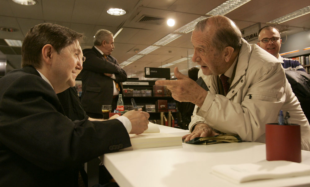 Federico Jiménez Losantos y Cesar Vidal firmaron sus libros en el Corte Inglés de Castellana. Como en sus últimas salidas, decenas de personas hicieron cola para llevarse un libro firmado. | J. Baró
