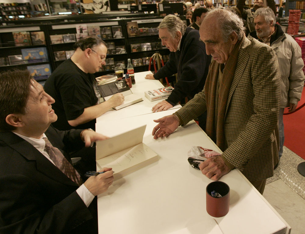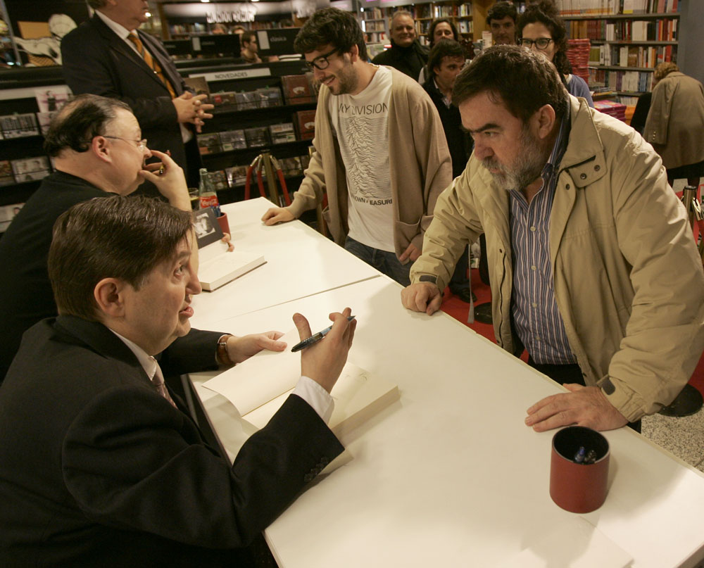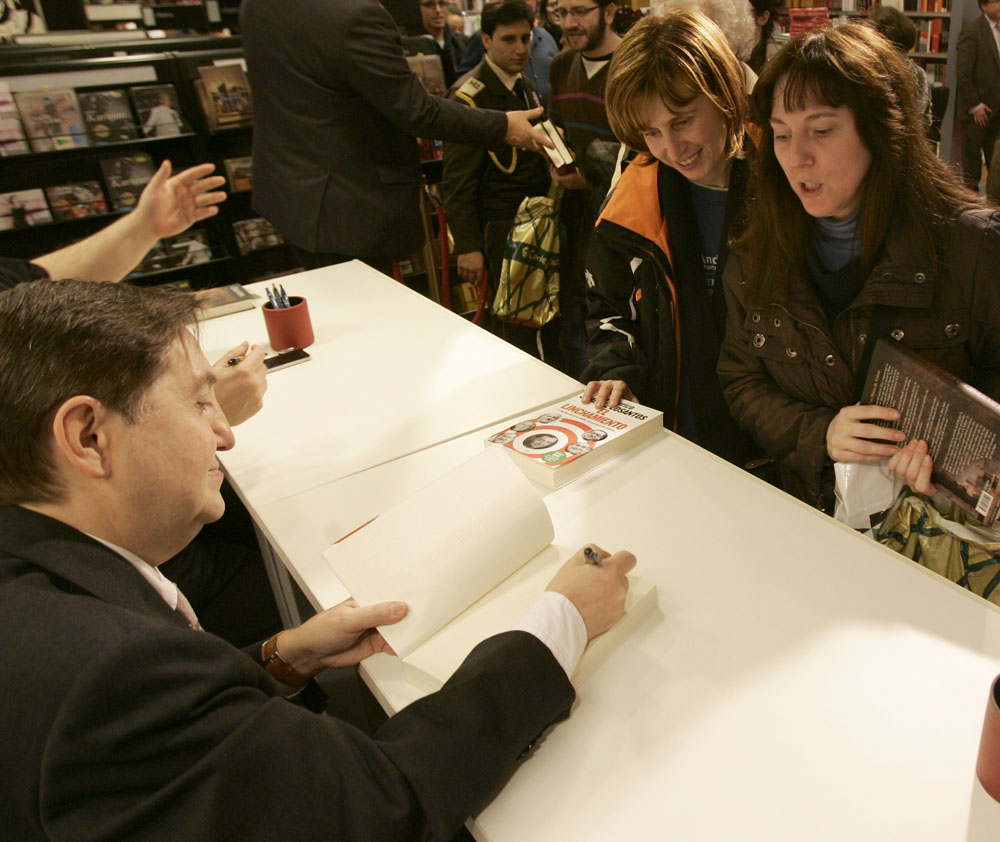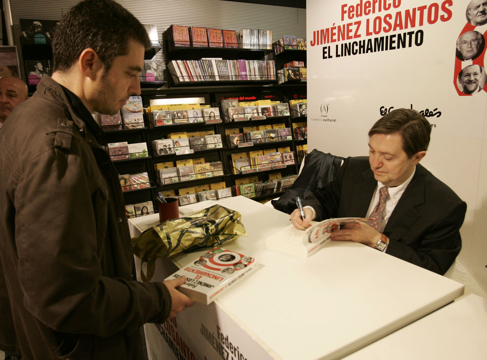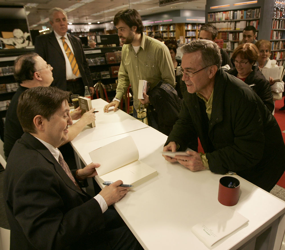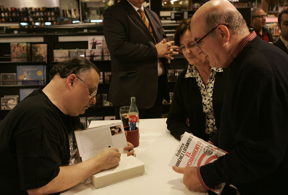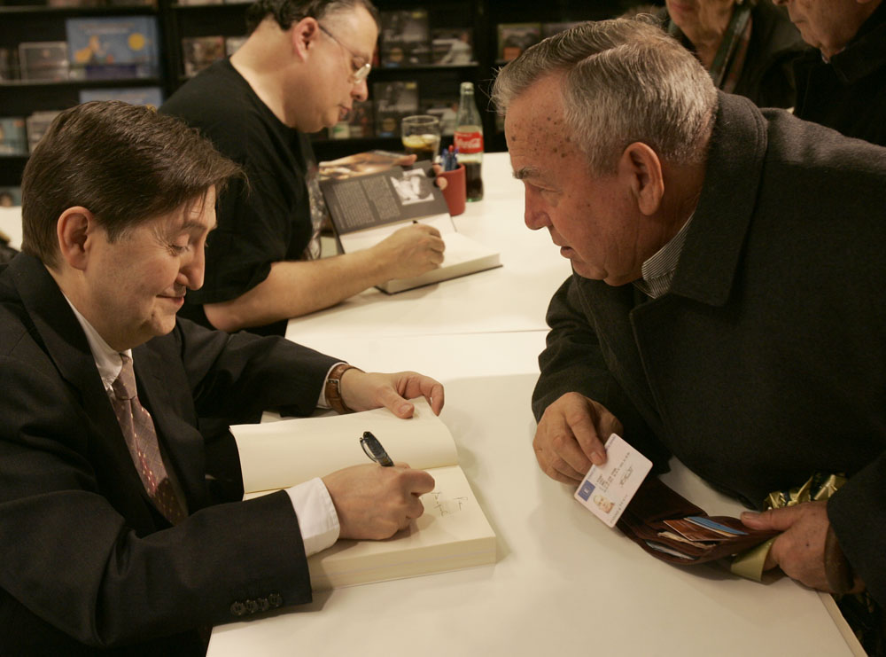 Federico Jiménez Losantos y Cesar Vidal firmaron sus libros en el Corte Inglés de Castellana. Como en sus últimas salidas, decenas de personas hicieron cola para llevarse un libro firmado. | J. Baró