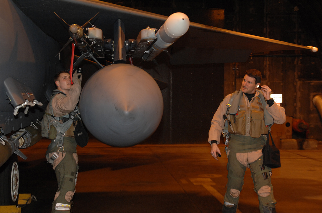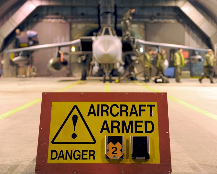 Operarios británicos arman uno de sus cazas para entrar en combate