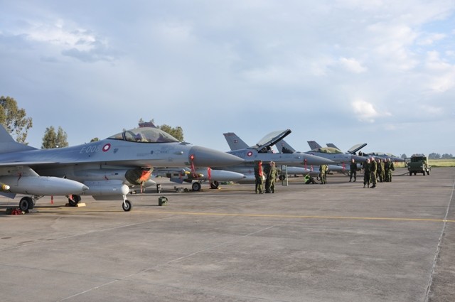 Algunos de los cazas aportados por Dinamarca para la operación contra Gadafi esperan entrar en acción en la base de Sicilia