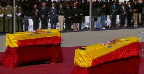 Los Reyes, junto con el jefe del Gobierno, José Luis Rodríguez Zapatero, autoridades civiles y la cúpula militar, rindieron un homenaje de despedida a los soldados Germán Pérez y Stanley Mera, muertos el lunes en un ataque contra las tropas españolas en Afganistán, en el funeral de Estado marcado por la sobriedad. (Imagen TV)