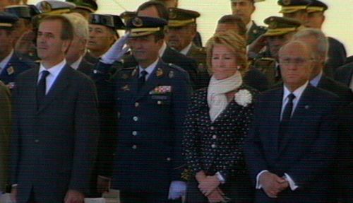El Príncipe de Asturias, la vicepresidenta del Gobierno y el Ministro de Defensa saludaron con gesto de pesar al paso de los féretros, ante los que, antes de ser introducidos en coches fúnebres para su traslado al Anatómico Forense de Madrid, el Vicario General castrense, monseñor Francisco Pérez González, ofició un responso. (Imagen TV)