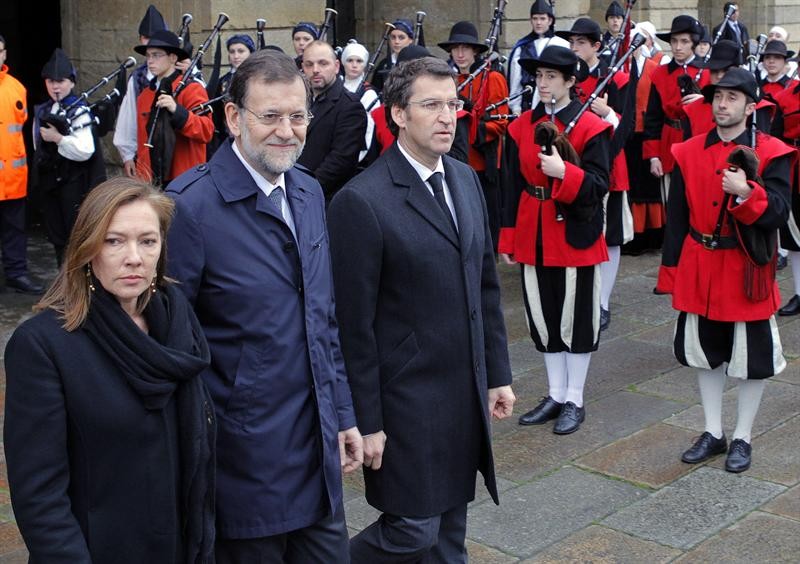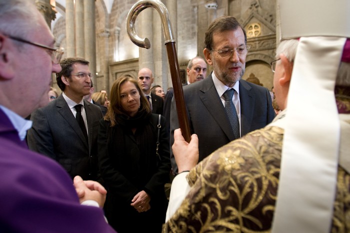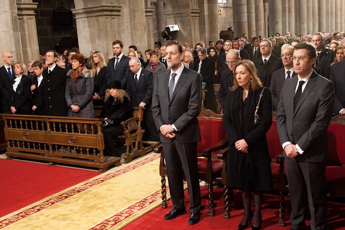 El presidente del Gobierno y su esposa, Elvira Fernández, asistieron junto al presidente de la Xunta y líder del PP gallego, Alberto Núñez Feijóo, al funeral del presidente fundador del PP.