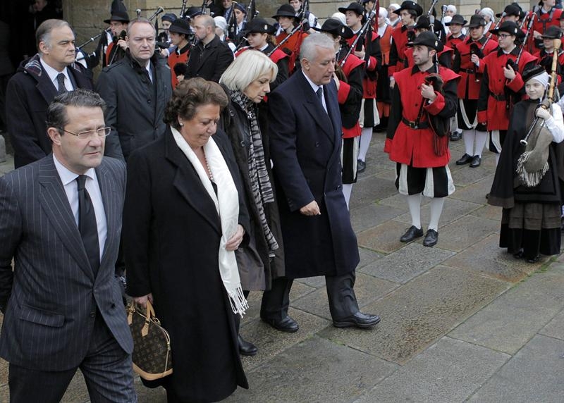 El alcalde de Santiago, Gerardo Conde Roa; las alcaldesas de Valencia, Rita Barberá y Cádiz, Teófila Martínez; el presidente del PP de Andalucía, Javier Arenas y detrás el portavoz del PP, Esteban González Pons, y el presidente valenciano, Alberto Fabra, al comienzo del funeral en memoria de Manuel Fraga, al que asisten las juntas directivas nacional y gallega del PP y destacados miembros del ejecutivo, esta mañana en Santiago de Compostela