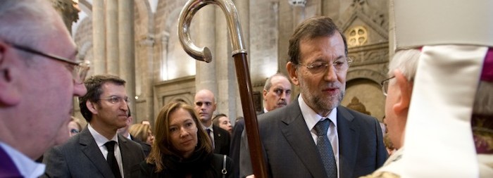 Mariano Rajoy saluda al arzobispo de Santiago, Julián Barrio.