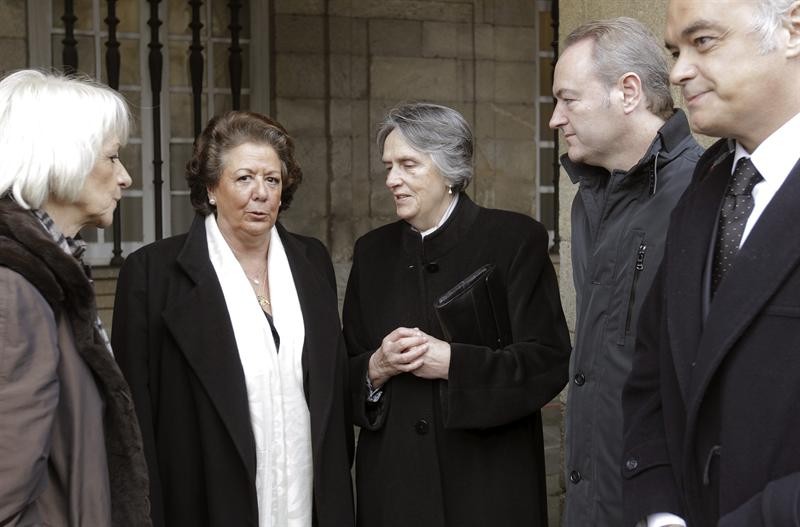 Charo Fraga, la hermana de Manuel Fraga (c), charla con (i-d), las alcaldesas de Cádiz, Teófila Martínez, y Valencia, Rita Barberá; el presidente de la Comunidad Valenciana, Alberto Fabra, y el vicesecretario de Comunicación del PP, Esteban González Pons.