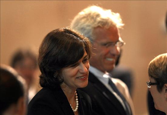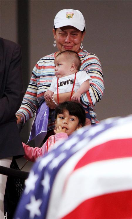 La esposa del senador Edward Kennedy, Victoria, y Joseph P. Kennedy II, saludan a los asistentes al velatorio del senador Edward Kennedy. EFE