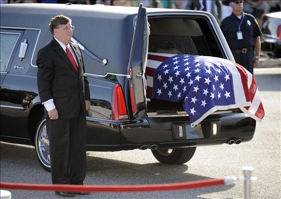 El féretro con los restos mortales del senador Edward Kennedy permanece en el interior del coche fúnebre a su llegada a la Biblioteca John F. Kennedy en Boston. EFE