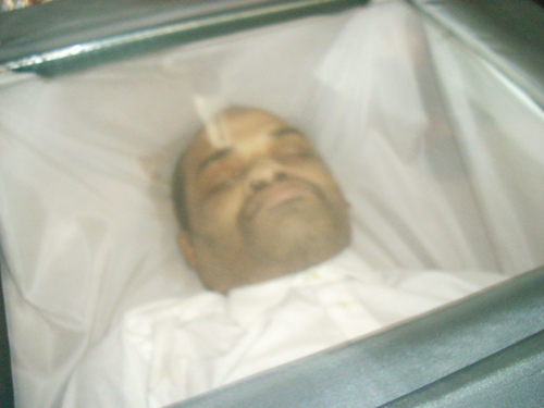 Instantánea del féretro descubierto de Orlando Zapata Tamayo. Bertha Antúnez, una exiliada en Miami, señala que su cara hinchada es una evidencia de las torturas que sufrió en prisión. (Imagen cedida por el Directorio Democrático Cubano)