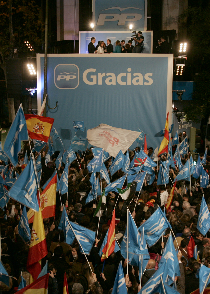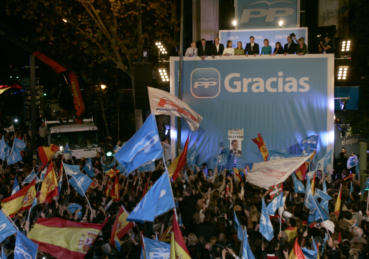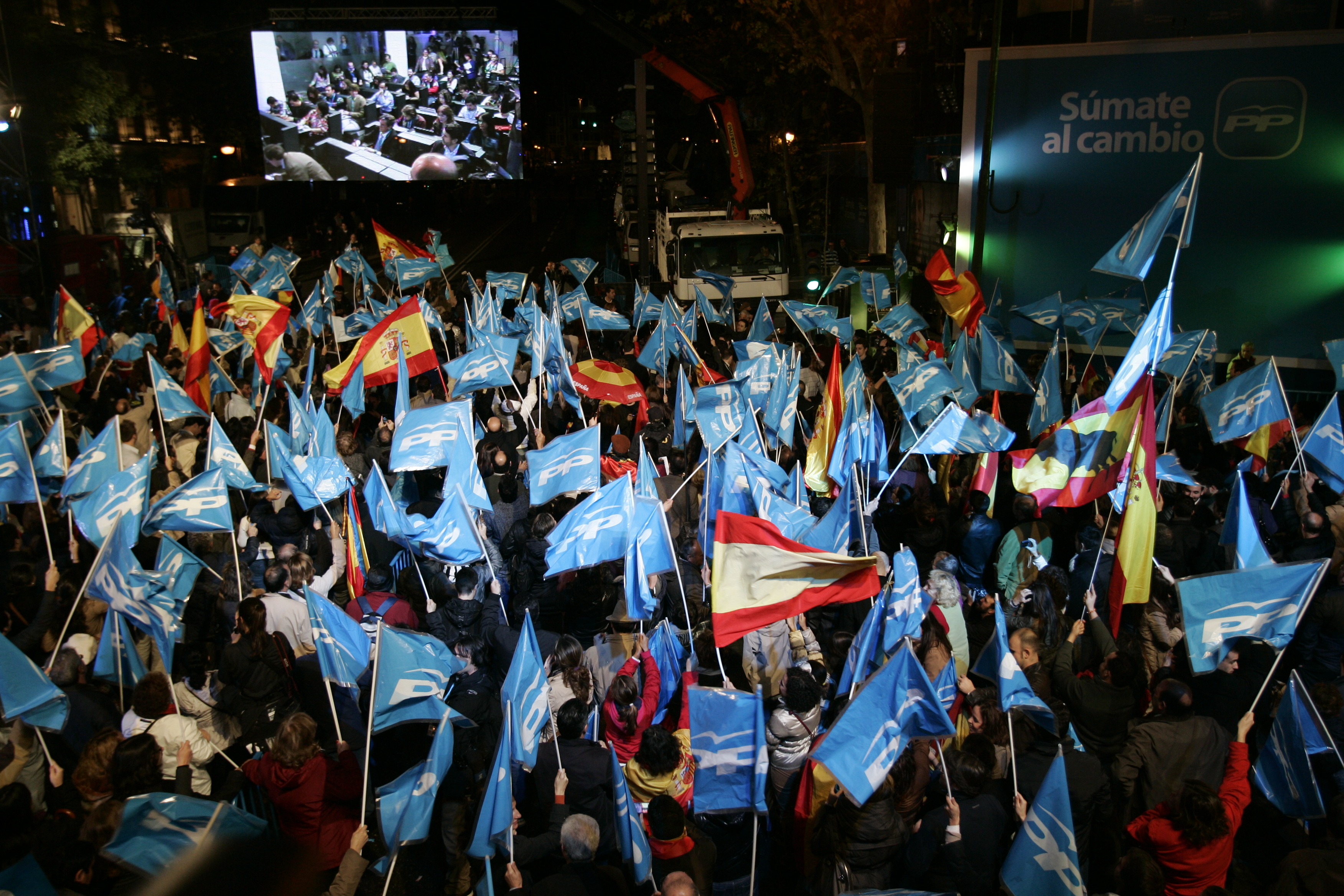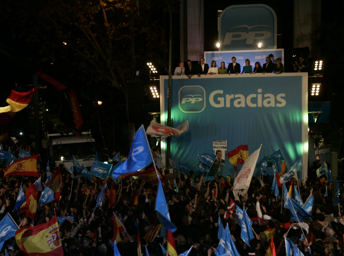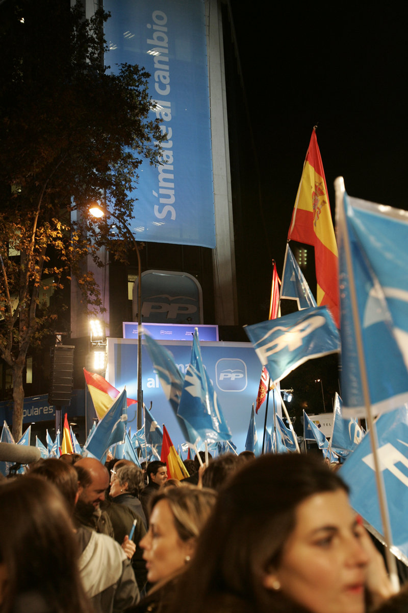 Desde la media tarde decenas de simopatizantes del PP comenzaban a llenar la madrileña calle Génova frente a la sede del partido. Pronto llegó la euroforia y al cierre de los colegios electorales podía verse un mar de banderas de España y del PP festejando, seguros de la victoria