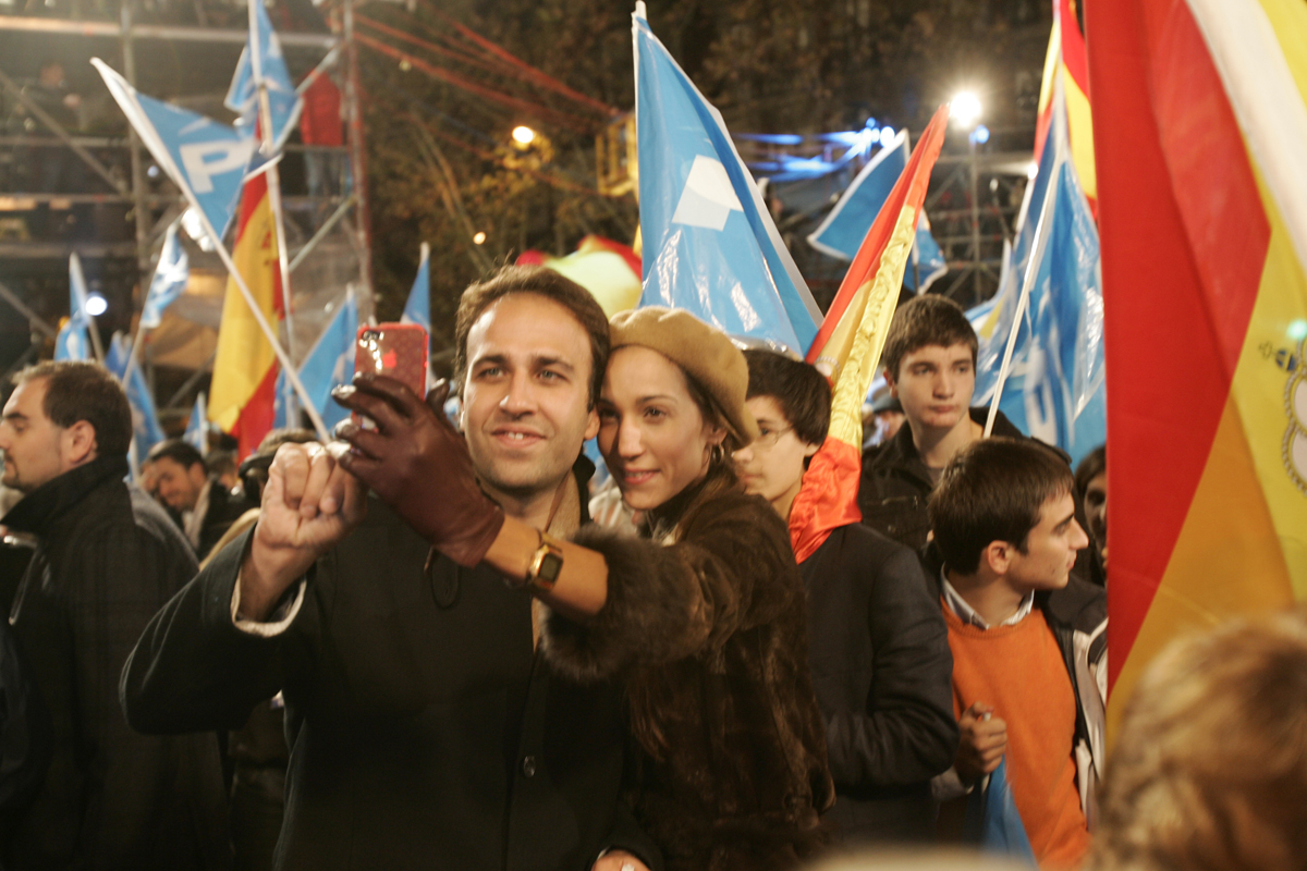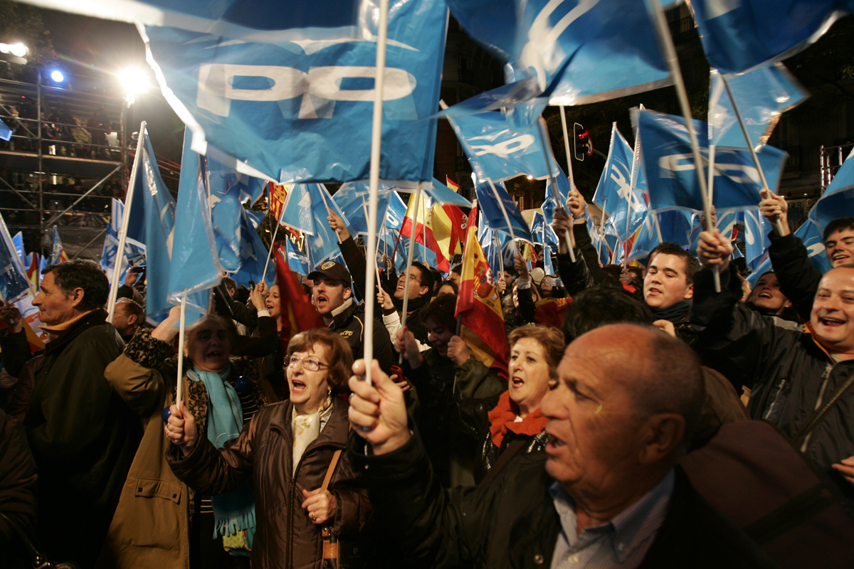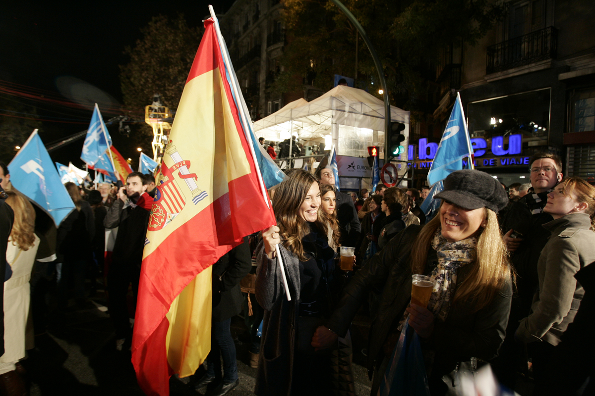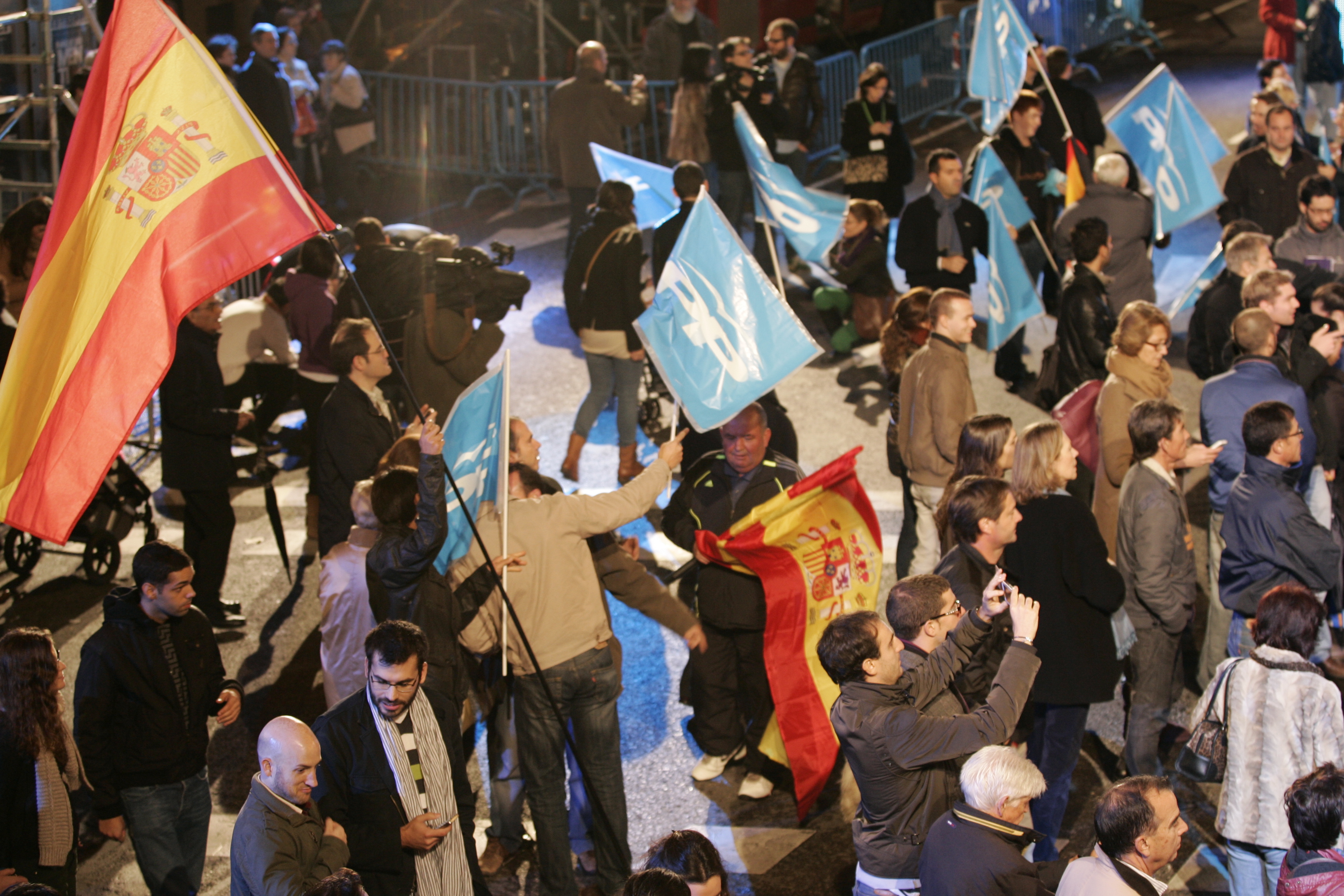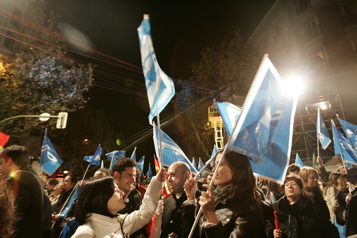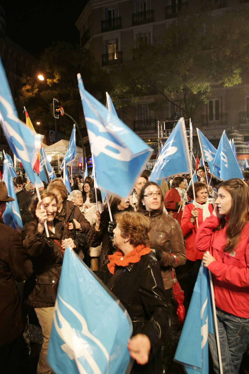 Desde la media tarde decenas de simopatizantes del PP comenzaban a llenar la madrileña calle Génova frente a la sede del partido. Pronto llegó la euroforia y al cierre de los colegios electorales podía verse un mar de banderas de España y del PP festejando, seguros de la victoria