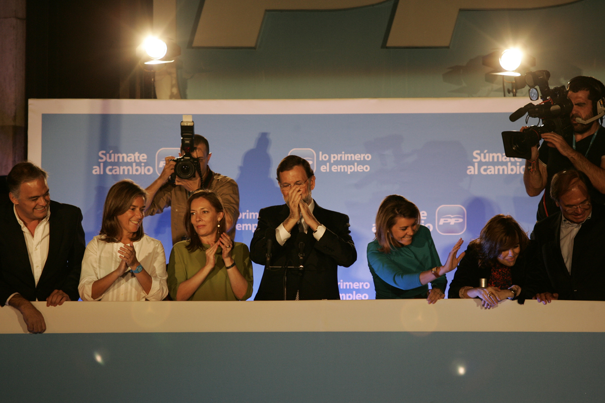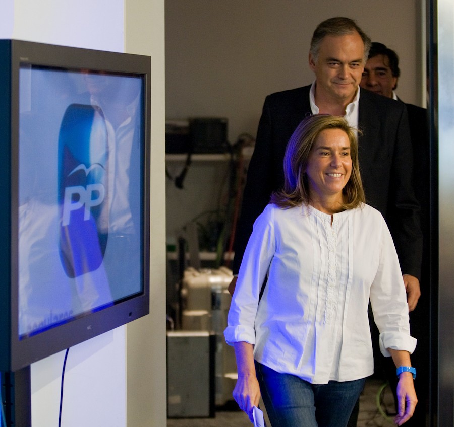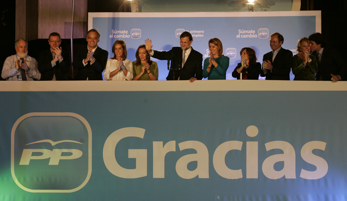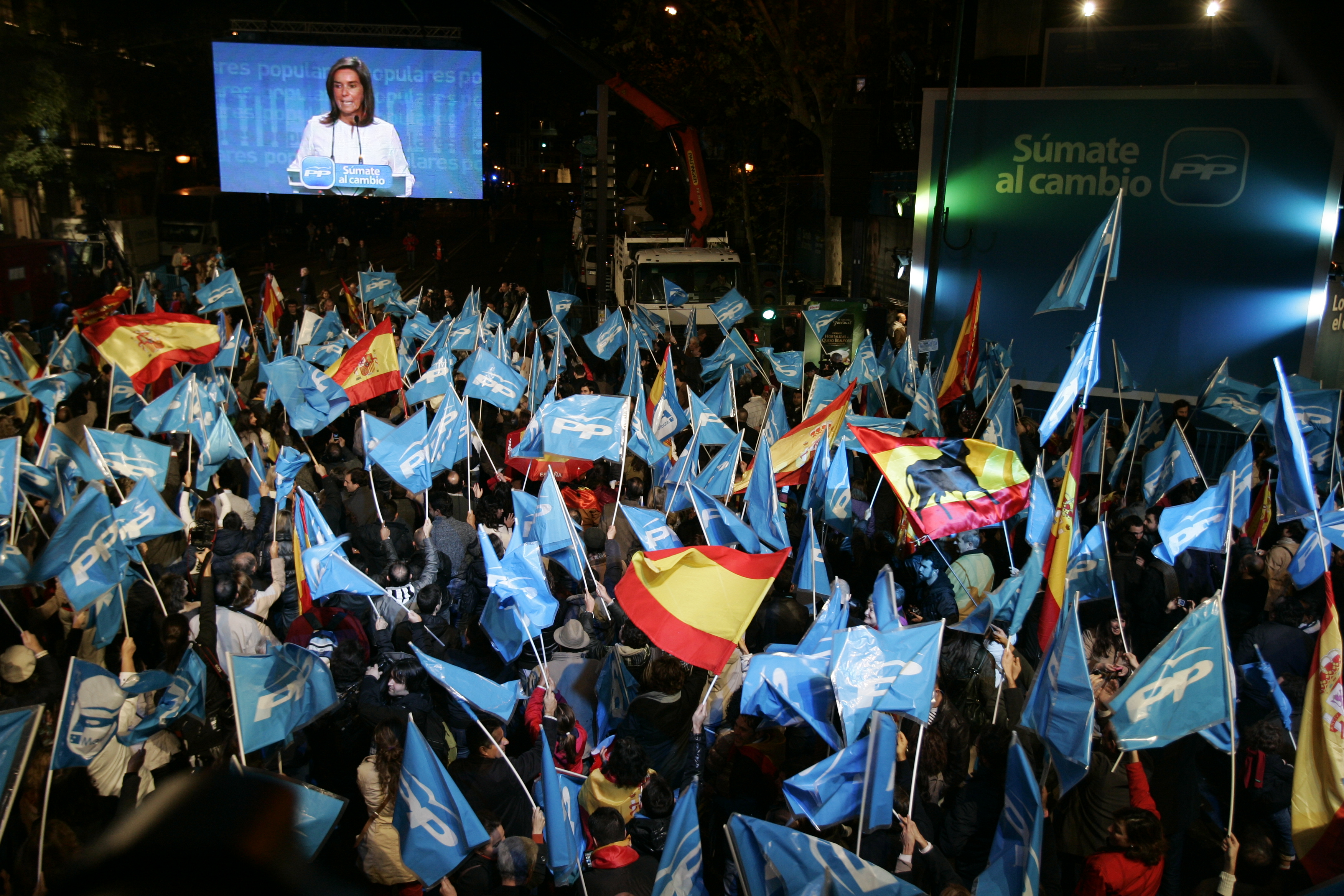 Ana Mato comparecía tras conocer los sondeos a pie de urna para anunciar que, de confirmarse, el PP había ganado las elecciones generales con mayoría absoluta. La multitud que se ha congregado en Génova escuchó con júbilo a Mato desde una enorme pantalla instalada por el PP en las afueras de la sede