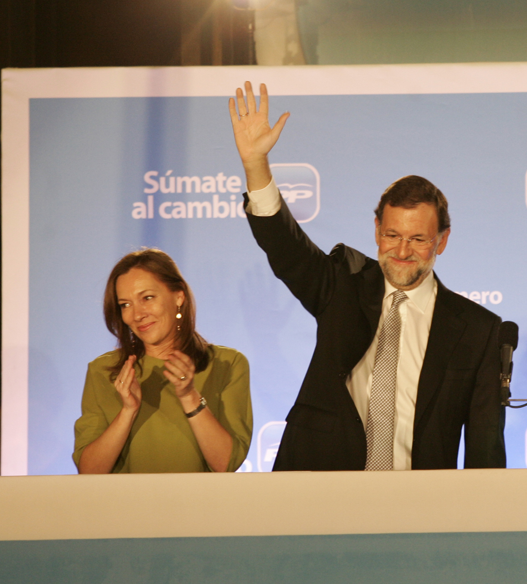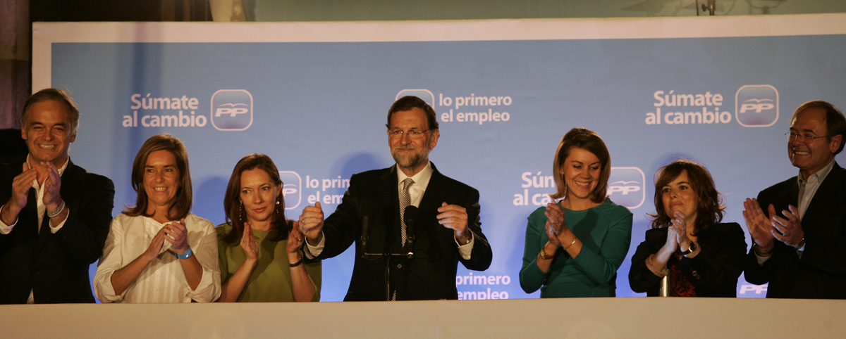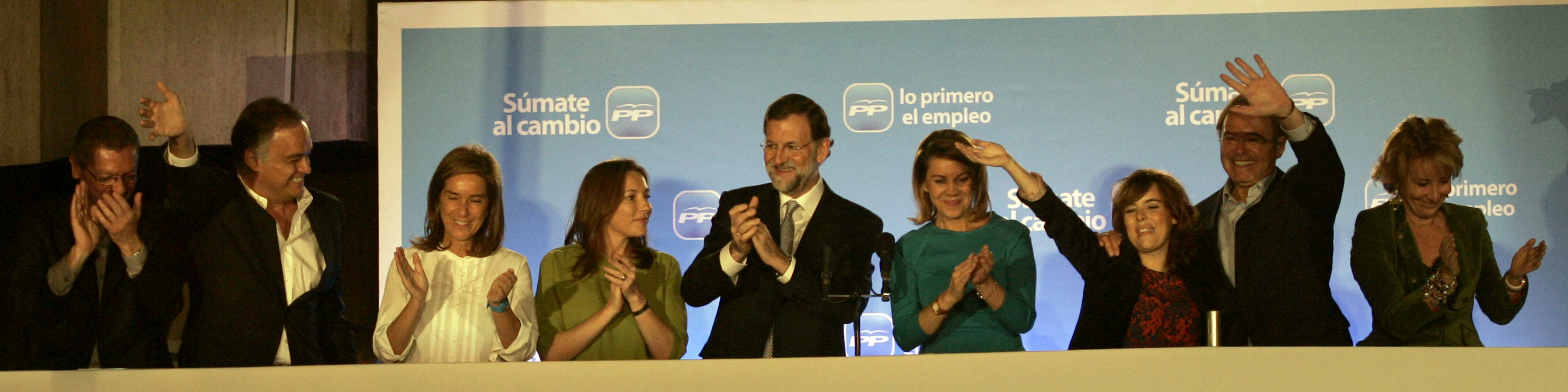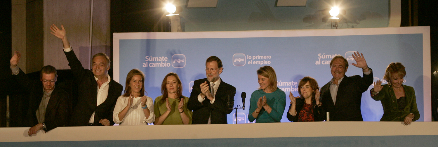 Ana Mato comparecía tras conocer los sondeos a pie de urna para anunciar que, de confirmarse, el PP había ganado las elecciones generales con mayoría absoluta. La multitud que se ha congregado en Génova escuchó con júbilo a Mato desde una enorme pantalla instalada por el PP en las afueras de la sede