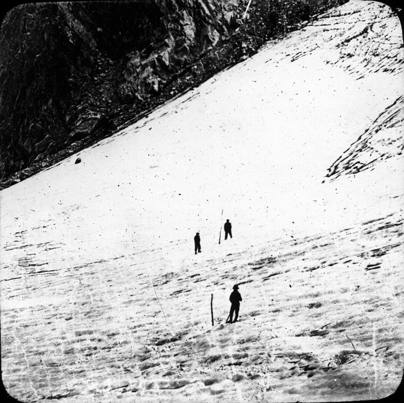 El glaciar de la Maladeta en una fotografía de principios del siglo XX, con toda seguridad en verano. Este glaciar fue uno de los objetivos preferidos de los primeros pirineístas, que subían hasta allí con un material muy primitivo.