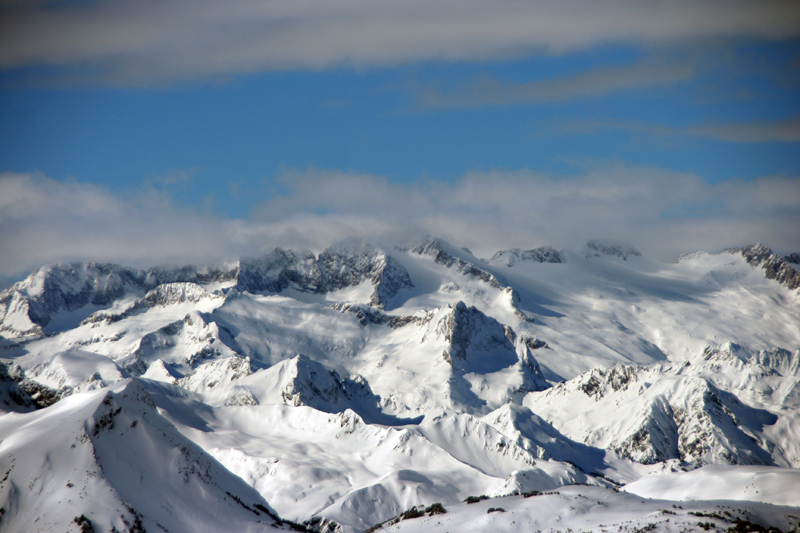 El macizo de Maladeta desde el aire en febrero de 2009. Tan sólo la crestería sobresale por encima de la nieve, que es muy duradera por encima de los 2.500 metros.