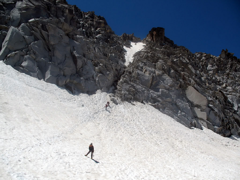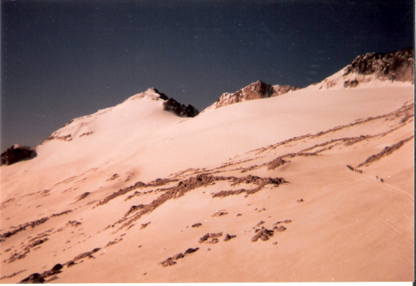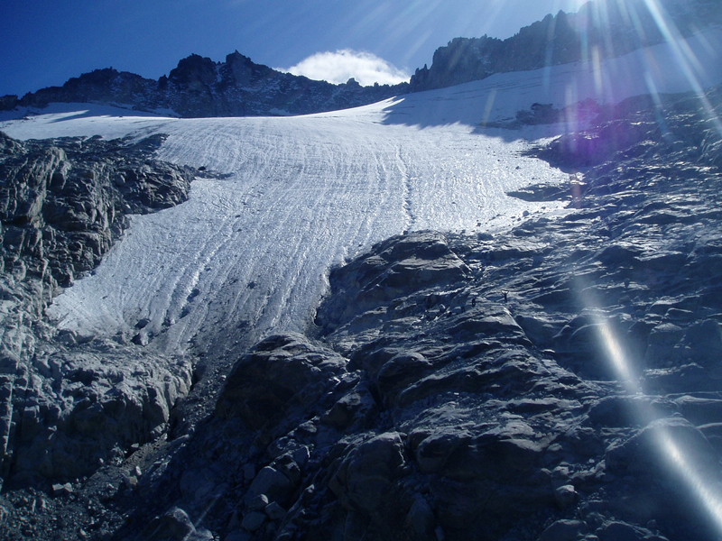 Dos escaladores ascienden en julio de 2007 por la parte alta del glaciar, que tiene una pendiente considerable.