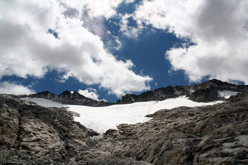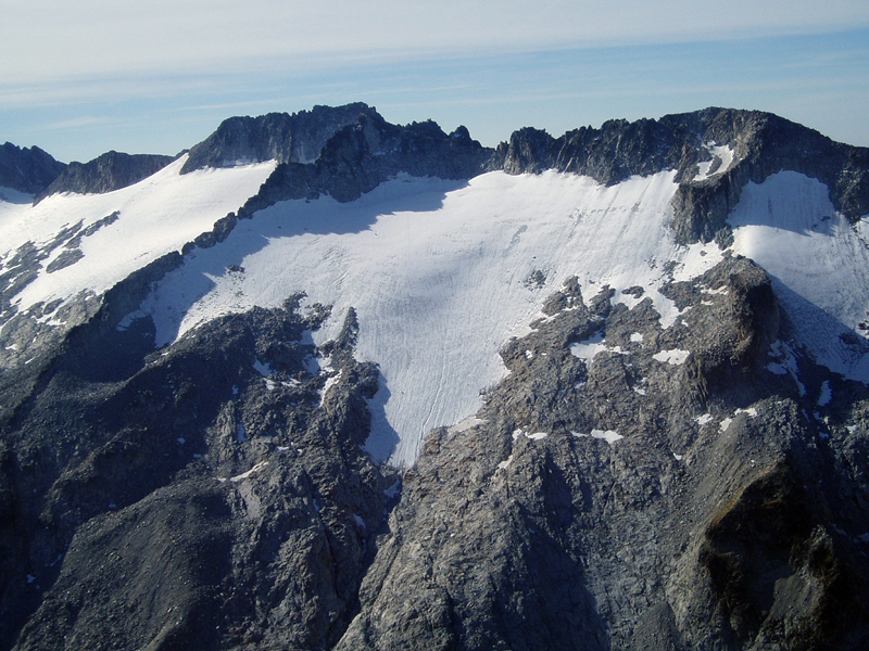 El glaciar visto desde el valle en el mes de julio de 2006. Se aprecia perfectamente la masa de hielo y las dos partes del glaciar, la oriental (izquierda) y la occidental (derecha)