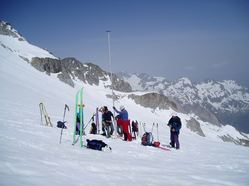 Un grupo de glaciólogos introduce una pértiga con forma de taladro en una medición de espesor realizada en el año 2004.