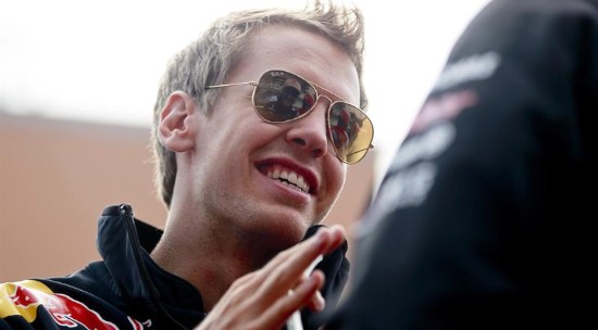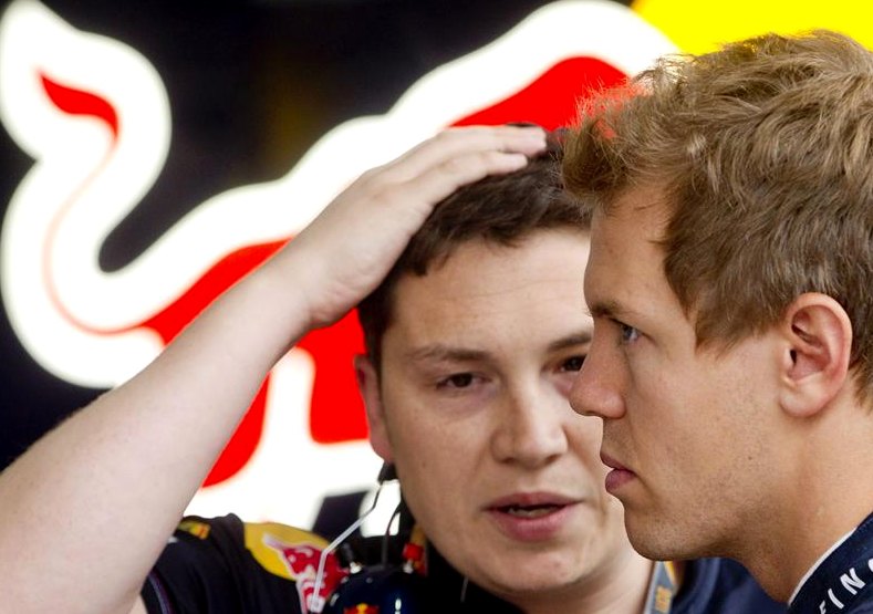 El alemán Sebastian Vettel (Red Bull), que el pasado domingo logró en Japón su segundo título mundial consecutivo, conversa en el paddock con el ingeniero Tim Maylon.