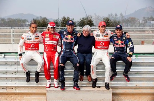 De izquierda a derecha, Lewis Hamilton (McLaren Mercedes), Fernando Alonso (Ferrari), Mark Webber (Red Bull), Bernie Ecclestone, Jenson Button (McLaren Mercedes) y Sebastian Vettel (Red Bull) posan para los fotógrafos en el circuito de Yeongam.