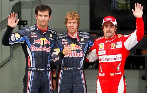 El australiano Mark Webber y el alemán Sebastian Vettel, de Red Bull, y el español Fernando Alonso, de Ferrari, celebran sus primeros puestos en la sesión de clasificación del Gran Premio de Corea en el Circuito Internacional de Yeongam.