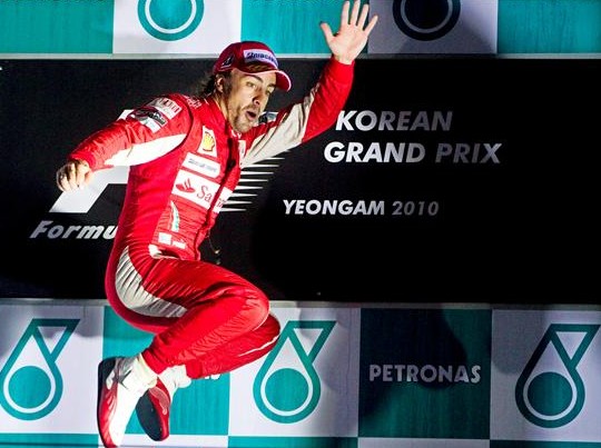 El español, exultante, celebra la victoria del Gran Premio de Corea dando un salto nada más subirse al podio.
