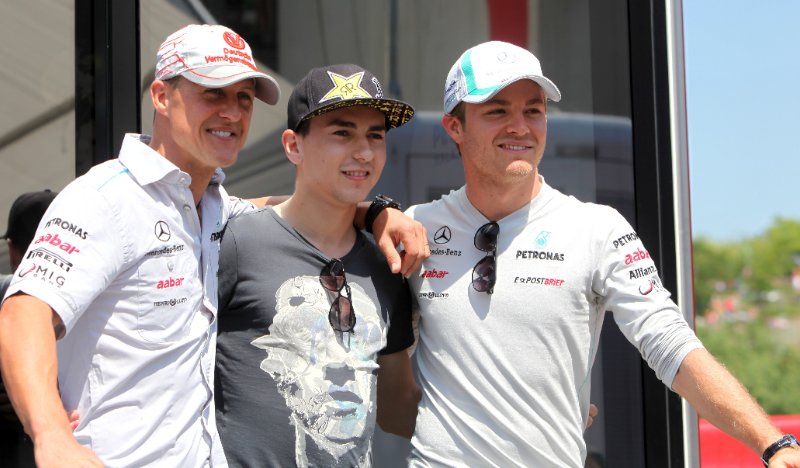El piloto de Yamaha, Jorge Lorenzo, también tuvo tiempo para pasarse por el circuito de Montmeló y hacerse una foto con los pilotos de Mercedes, Michael Schumacher (izd) y Nico Rosberg.