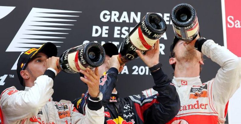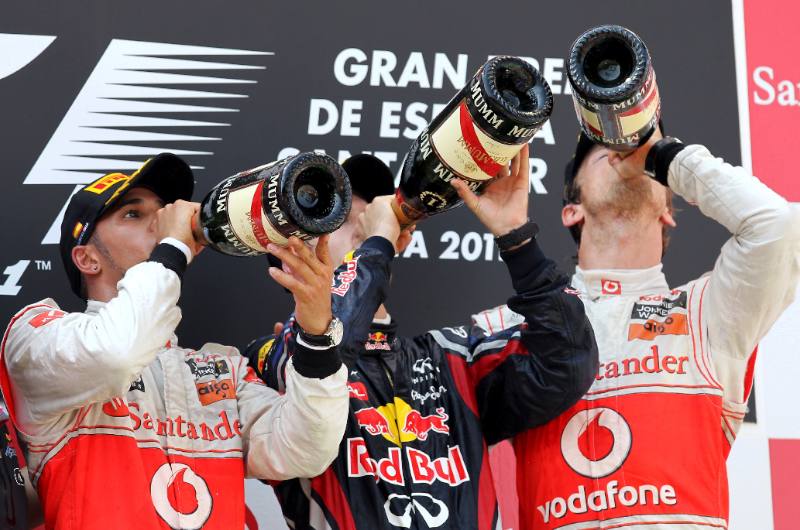 Los tres pilotos del podio. El ganador Sebastian Vettel, en el centro acompañado por Lewis Hamilton (izd) y Jenson Button bebiendo el tradicional champán que se da en la entrega de premios.