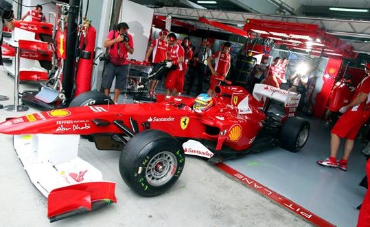 El español Fernando Alonso, con el F150 Italia en su box de Ferrari.
