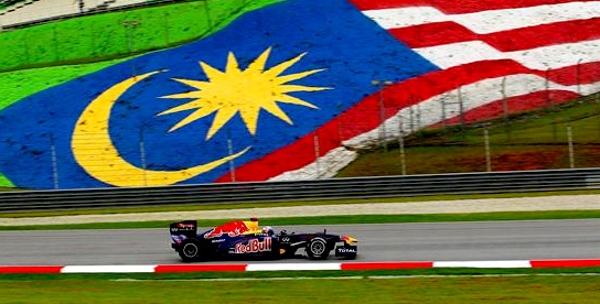 El alemán Sebastian Vettel, actual campeón mundial, con su monoplaza de Red Bull y una bandera de Malasia al fondo.