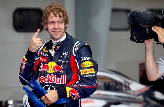 El alemán Sebastian Vettel se muestra exultante después de lograr la pole.