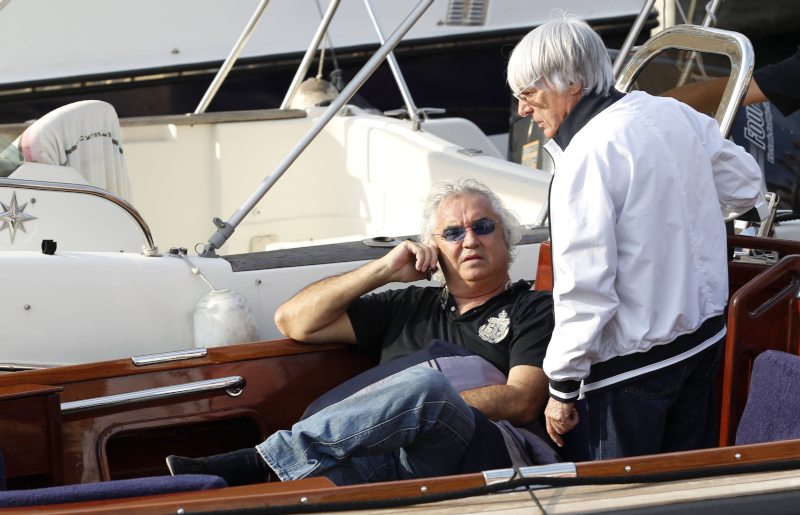El patrón de la Fórmula Uno, Bernie Ecclestone, saluda a la cantante Geri Halliwell.