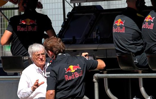 El británico Bernie Ecclestone, patrón de la Fórmula Uno, conversa con un mecánico de la escudería Red Bull, durante la primera sesión de entrenamientos libres.