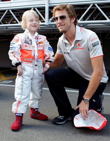 El piloto británico Jenson Button (d) posa con un niño que luce los colores de su equipo, McLaren Mercedes.