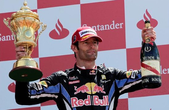 El piloto australiano de Fórmula Uno Mark Webber, de Red Bull, celebra su triunfo en Silverstone. El británico Lewis Hamilton (McLaren Mercedes) ha quedado en segunda posición por delante del alemán Nico Rosberg (Mercedes GP).
