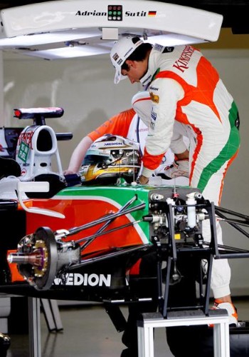 El piloto alemán Adrian Sutil, de la escudería Force India, accede a su monoplaza en el garaje de su equipo en el circuito de Estambul. (EFE)