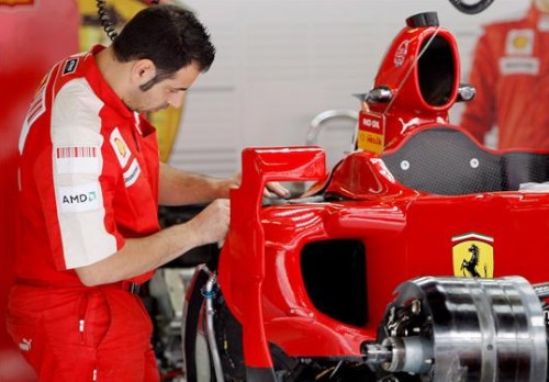 Los mecánicos de Ferrari asisten al piloto finlandés Kimi Raikkonen en el 'pit-lane'. (EFE)