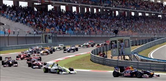 El alemán Sebastian Vettel (dcha), de Red Bull, encabeza el grupo de corredores tras darse la salida del GP de Turquía de Fórmula 1, disputado en el circuito de Estambul. (EFE)