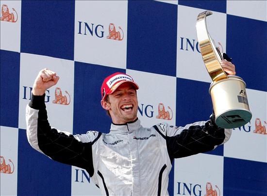 El británico Jenson Button muestra en el podio del autódromo de Estambul el trofeo que le acredita como vencedor del GP de Turquía. (EFE)
