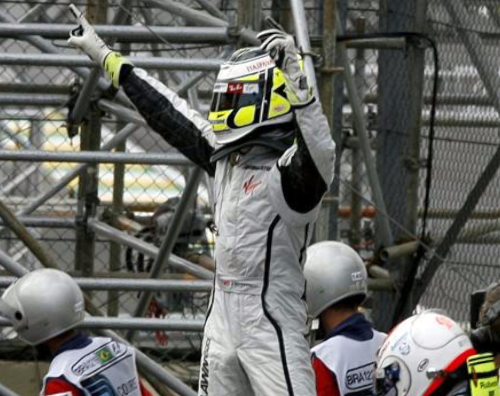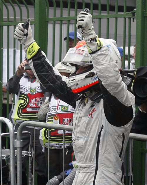 Barrichello celebra la pole lograda bajo la intensa lluvia en Brasil. (EFE)