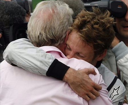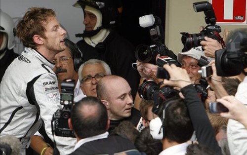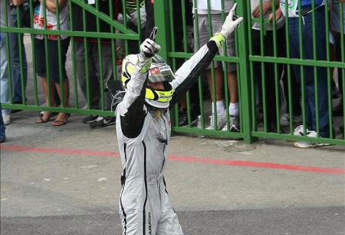 El piloto británico Jenson Button de la escudería Brawn GP celebra la consagración del título. (EFE)