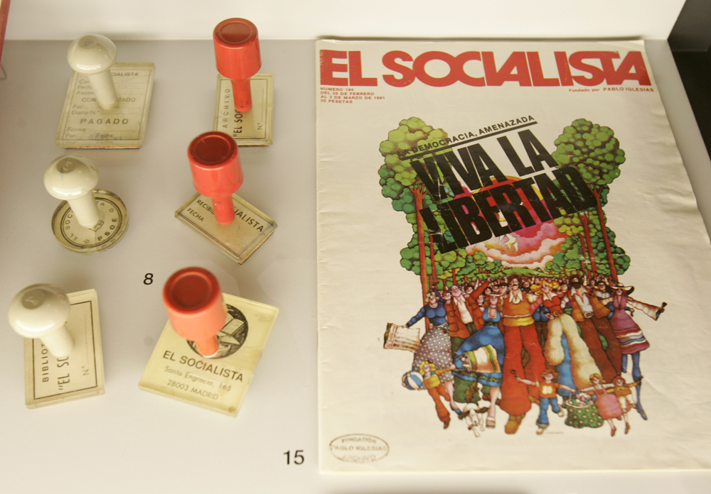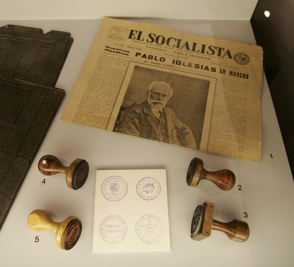 Una portada de El Socialista y varios sellos utilizados por el PSOE.