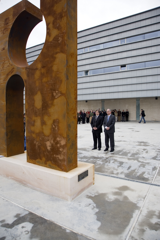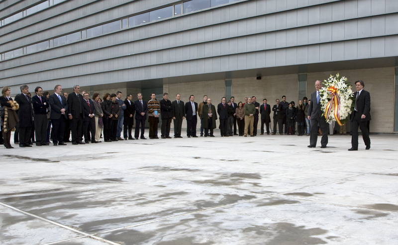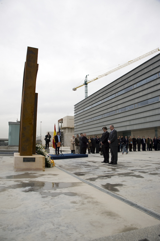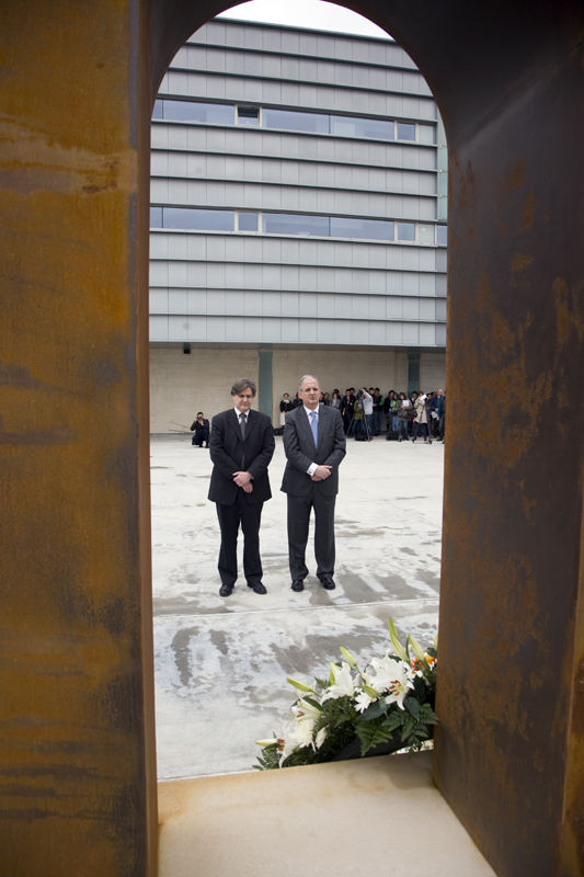 González y Denoix guardan silencio frente a la ofrenda floral situada sobre el monumento a las víctimas del Terrorismo, conocido como La puerta del recuerdo.
