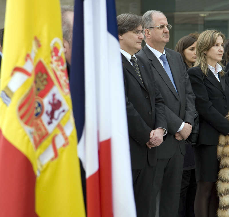 Cayetano González y Guillaume Denoix llevan la corona floral en homenaje a Jean-Serge Nérin.
