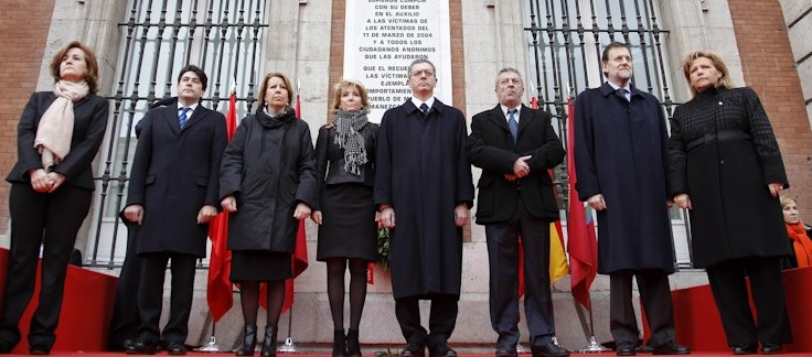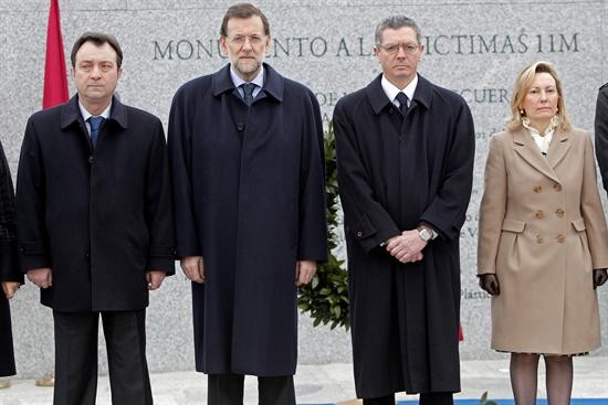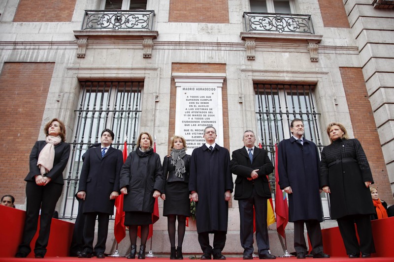 La presidenta de la Comunidad de Madrid, Esperanza Aguirre, y el alcalde de Madrid, Alberto Ruiz Gallardón, frente a la capa conmemorativa del terrible atentado